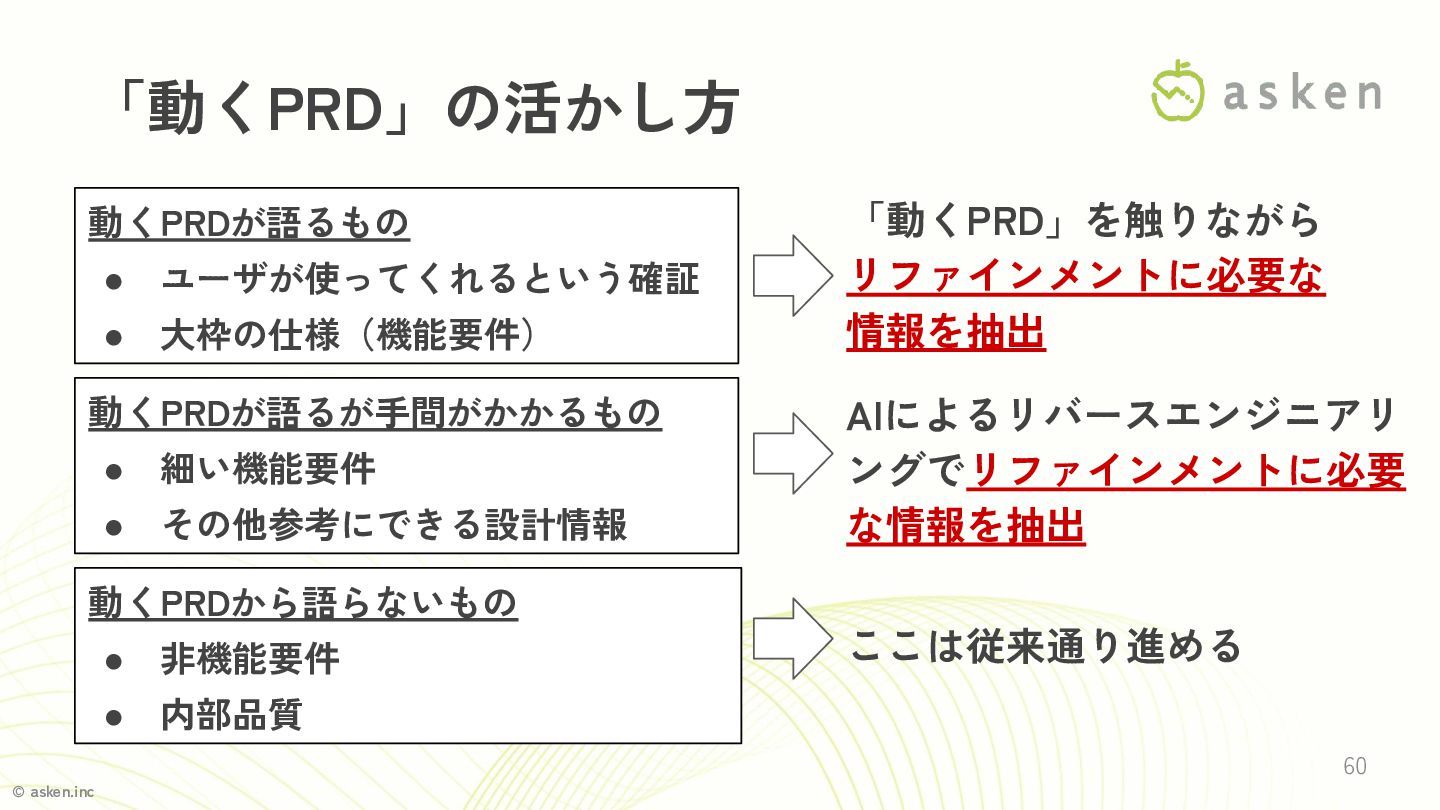 © asken.inc 60 「動くPRD」の活かし方 「動くPRD」を触りながら リファインメントに必要な 情報を抽出 ここは従来通り進める AIによるリバースエンジニアリ ングでリファインメントに必要