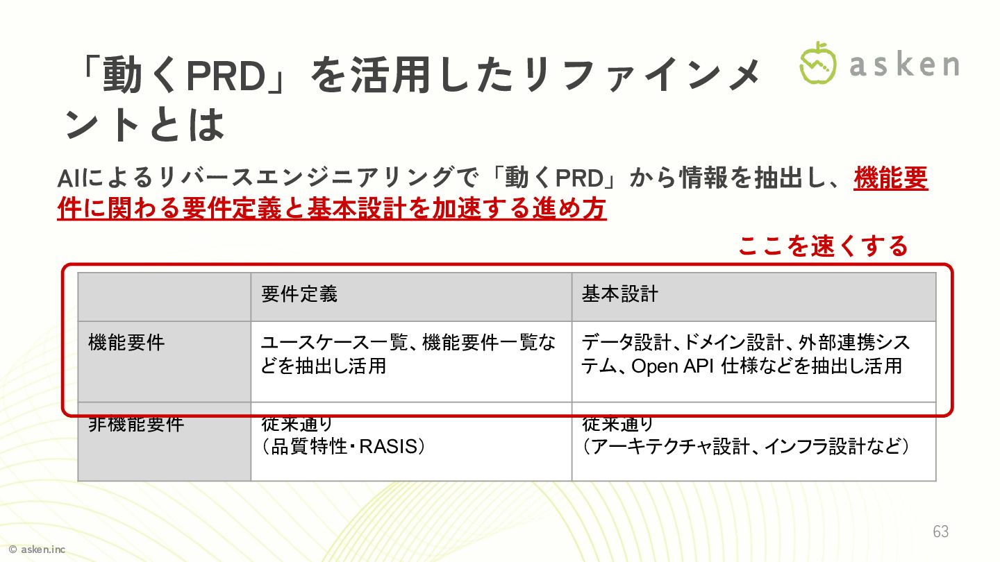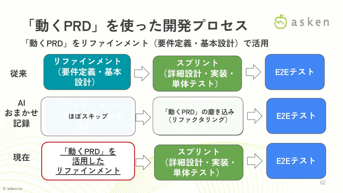 © asken.inc 「動くPRD」をリファインメント(要件定義・基本設計)で活用 62 「動くPRD」を使った開発プロセス 現在 従来 AI おまかせ 記録