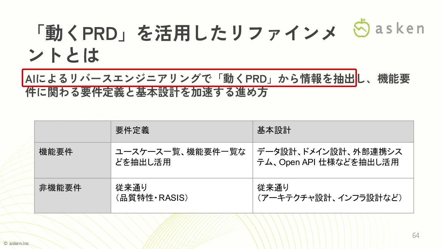 © asken.inc 63 AIによるリバースエンジニアリングで「動くPRD」から情報を抽出し、機能要 件に関わる要件定義と基本設計を加速する進め方 要件定義 基本設計 機能要件 ユースケース一覧、機能要件一覧な どを抽出し活用