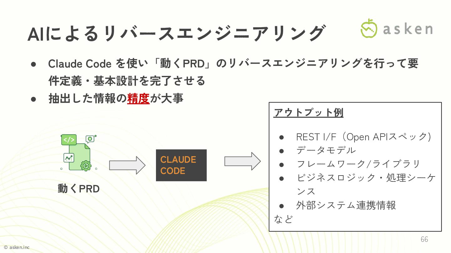 © asken.inc 66 AIによるリバースエンジニアリング • Claude Code を使い「動くPRD」のリバースエンジニアリングを行って要 件定義・基本設計を完了させる •