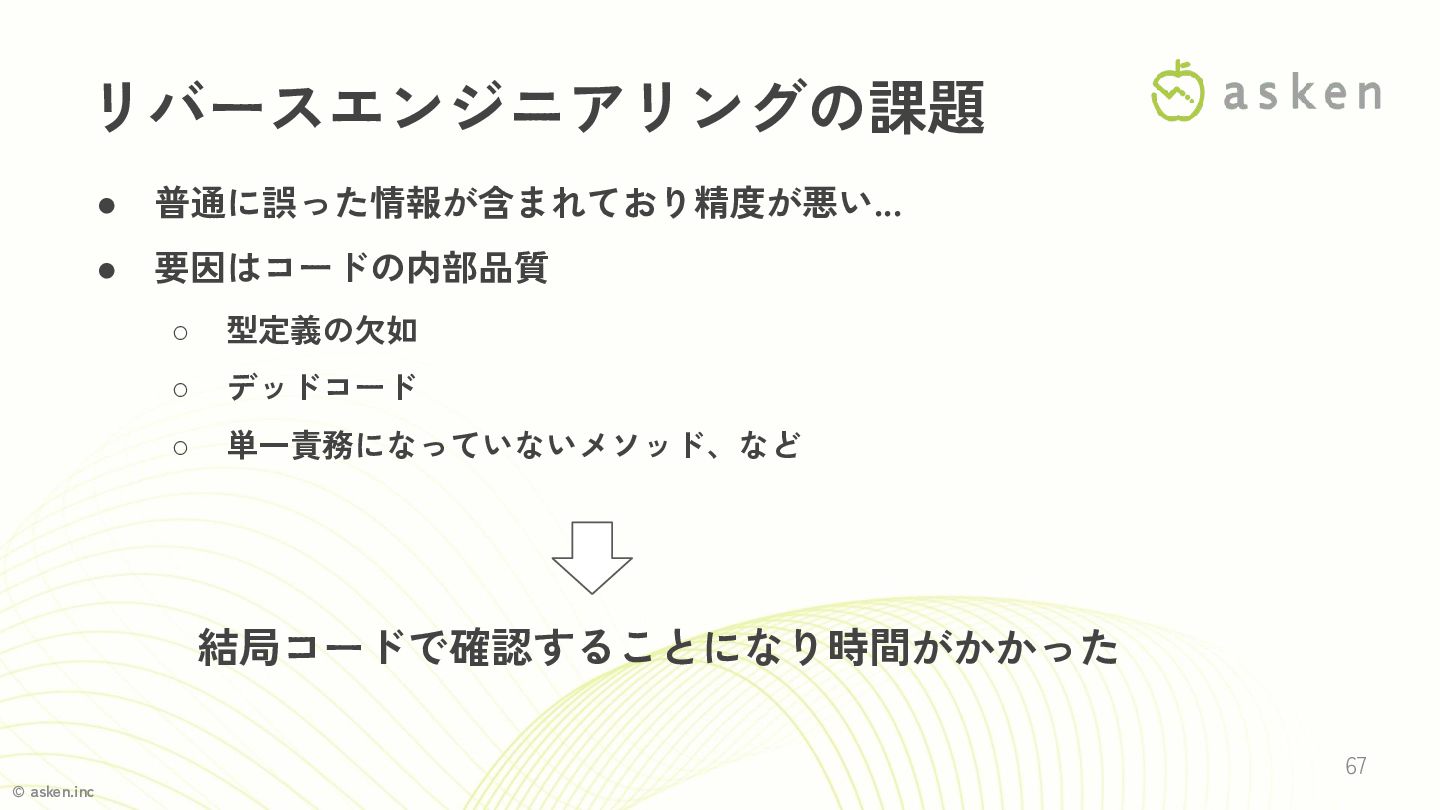 © asken.inc 67 リバースエンジニアリングの課題 • 普通に誤った情報が含まれており精度が悪い... • 要因はコードの内部品質 ◦ 型定義の欠如