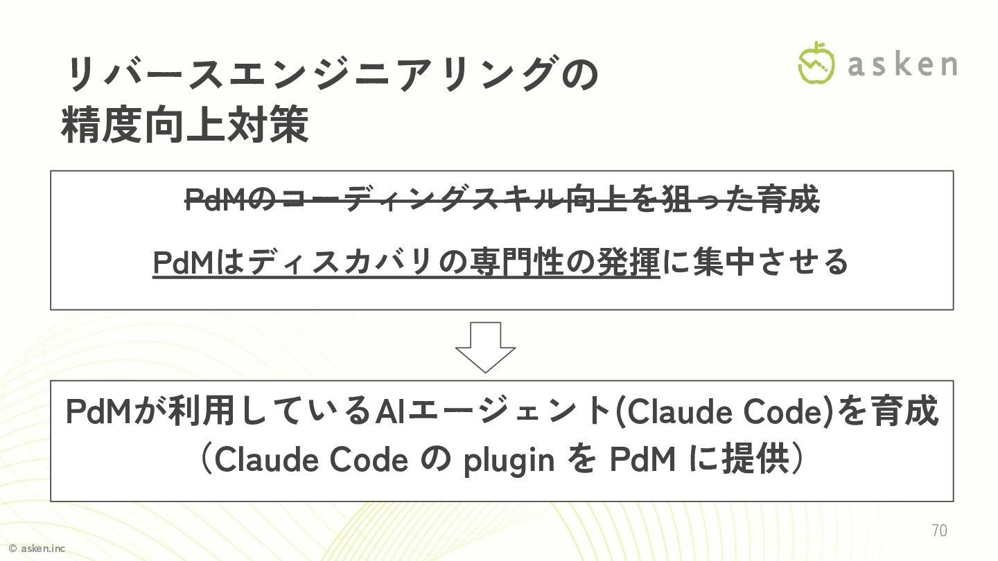 © asken.inc 70 リバースエンジニアリングの 精度向上対策 PdMのコーディングスキル向上を狙った育成 PdMはディスカバリの専門性の発揮に集中させる PdMが利用しているAIエージェント(Claude Code)を育成 (Claude