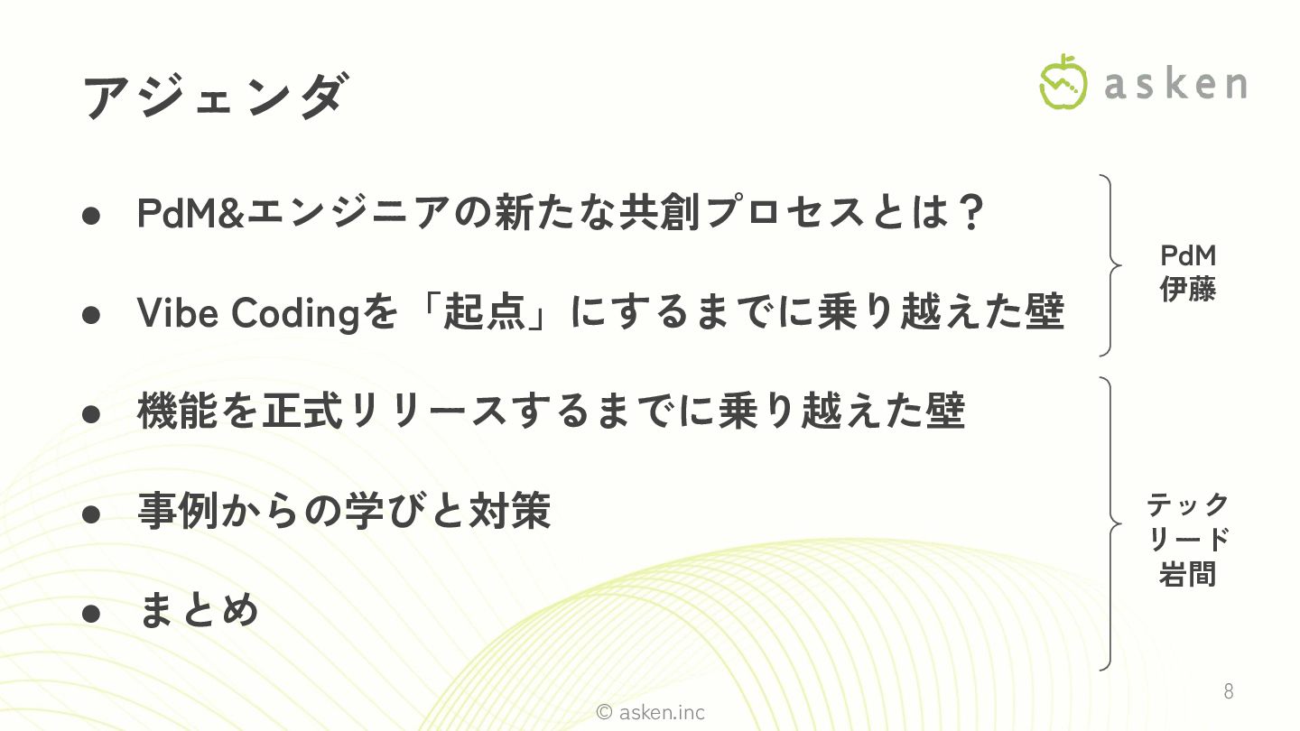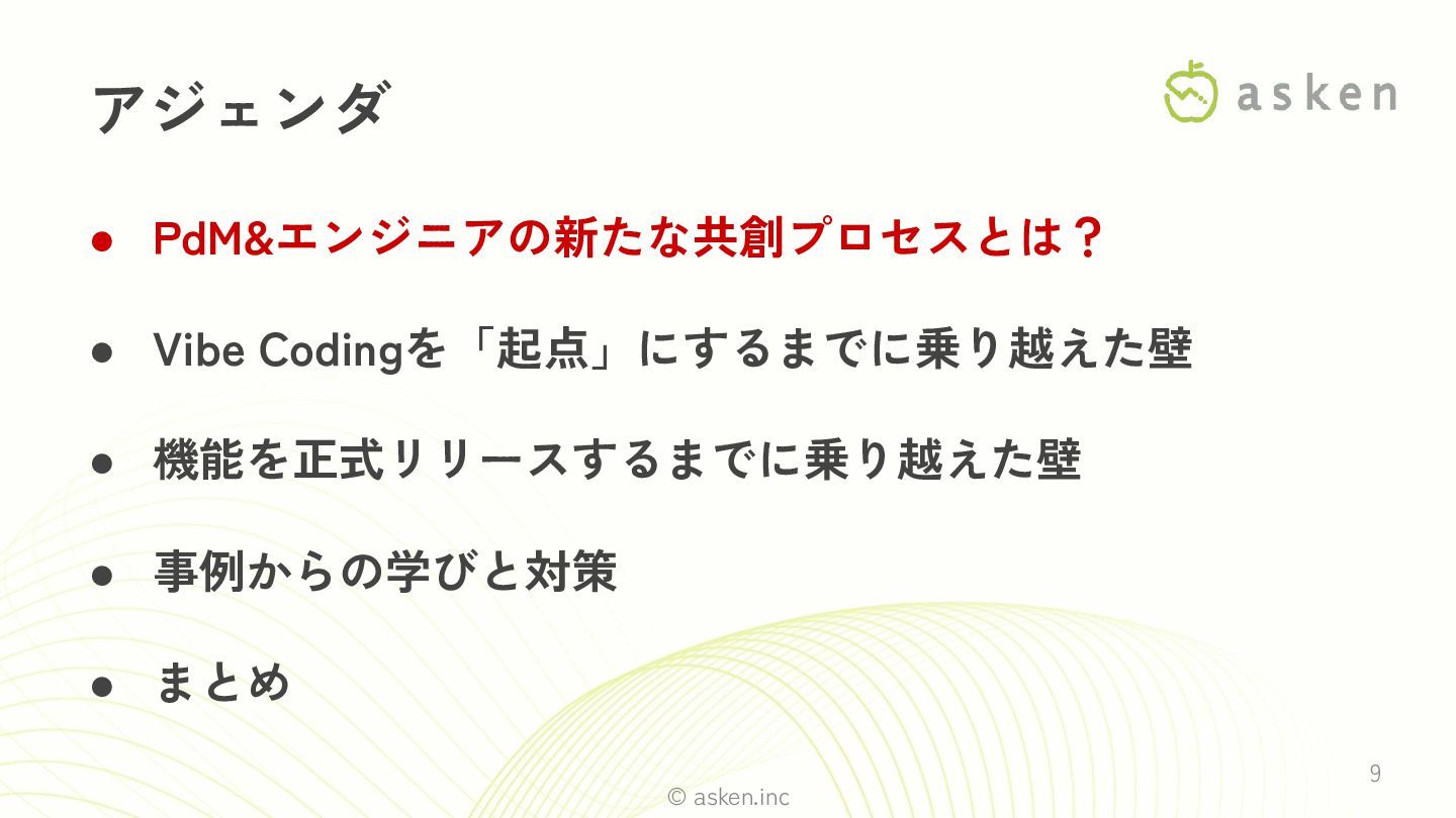 © asken.inc 8 • PdM&エンジニアの新たな共創プロセスとは? • Vibe Codingを「起点」にするまでに乗り越えた壁 • 機能を正式リリースするまでに乗り越えた壁