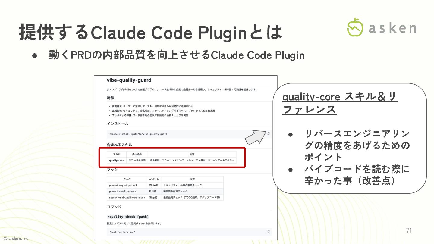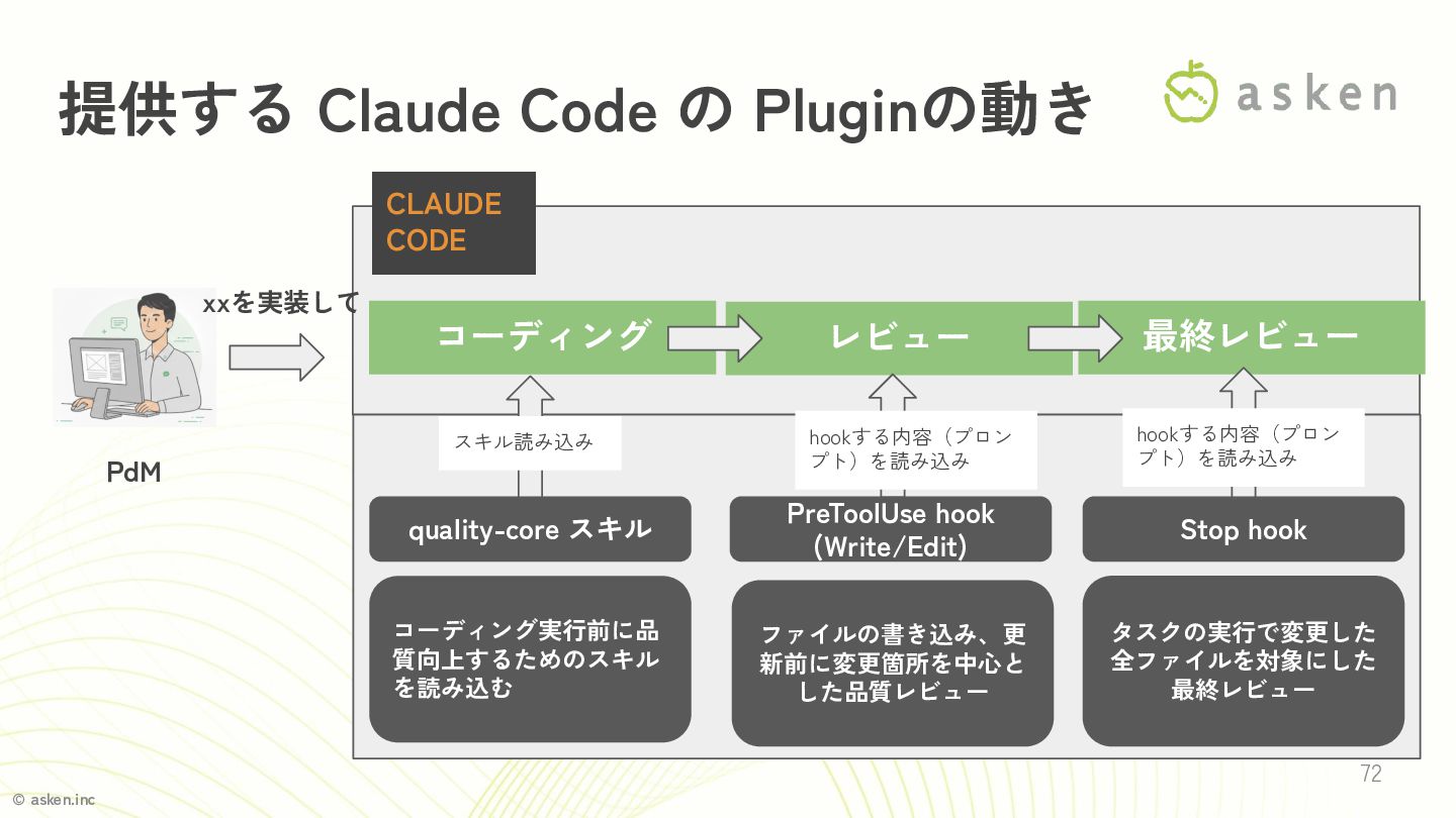 © asken.inc 71 提供するClaude Code Pluginとは • 動くPRDの内部品質を向上させるClaude Code Plugin
