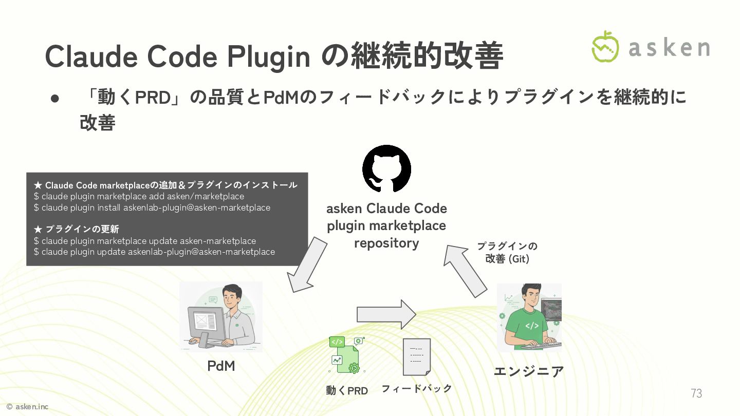© asken.inc 73 Claude Code Plugin の継続的改善 • 「動くPRD」の品質とPdMのフィードバックによりプラグインを継続的に 改善