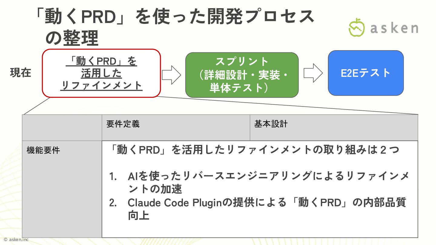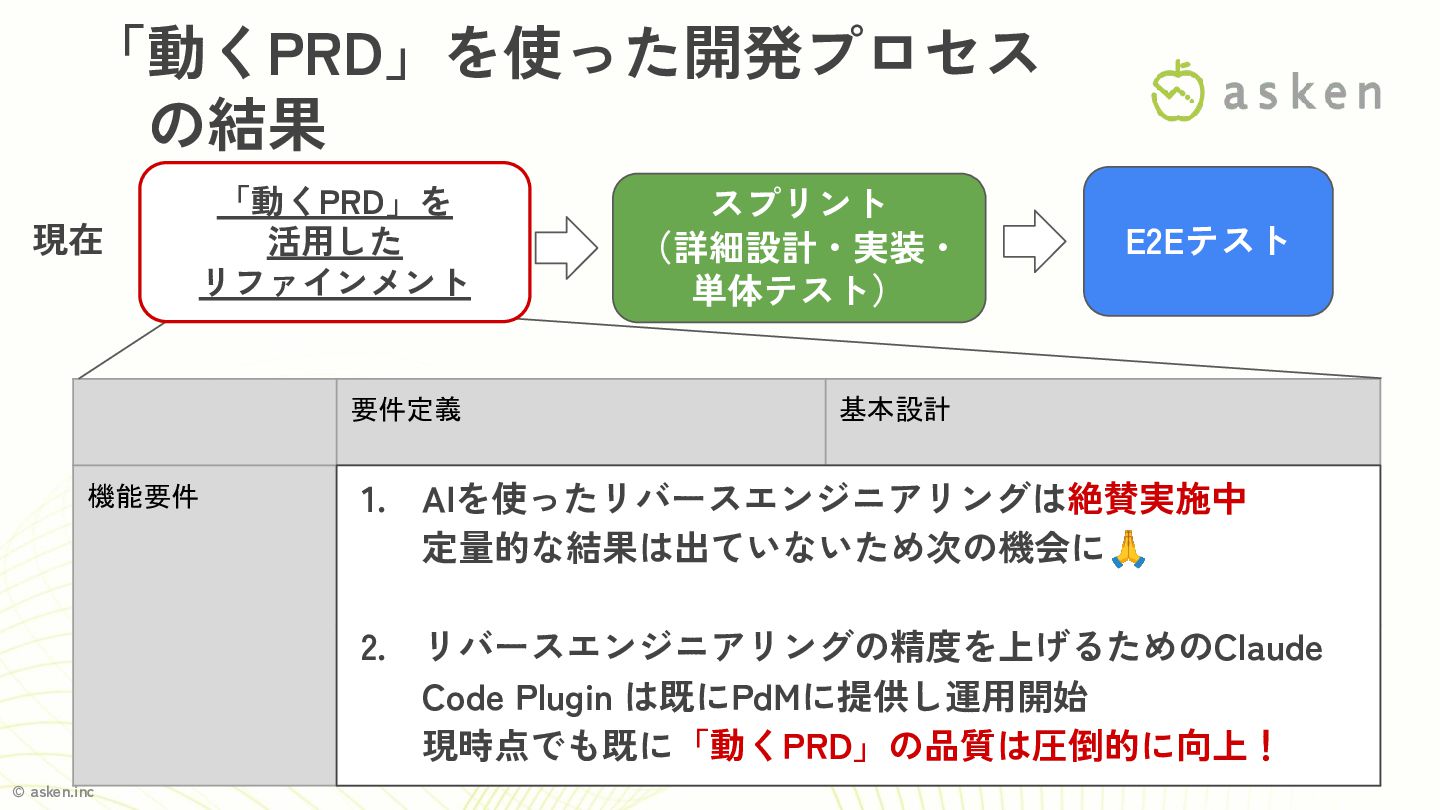 データ設計、ドメイン設計、外部連携システ ム、Open API 仕様などを抽出し活用 従来通り (品質特性・RASIS) 従来通り (アーキテクチャ設計、インフラ設計など) 1. AIを使ったリバースエンジニアリングは絶賛実施中 定量的な結果は出ていないため次の機会に🙏 2. リバースエンジニアリングの精度を上げるためのClaude Code Plugin は既にPdMに提供し運用開始 現時点でも既に「動くPRD」の品質は圧倒的に向上! 現在 E2Eテスト リファインメント (要件定義・基本 設計) スプリント (詳細設計・実装・ 単体テスト) 「動くPRD」を 活用した リファインメント