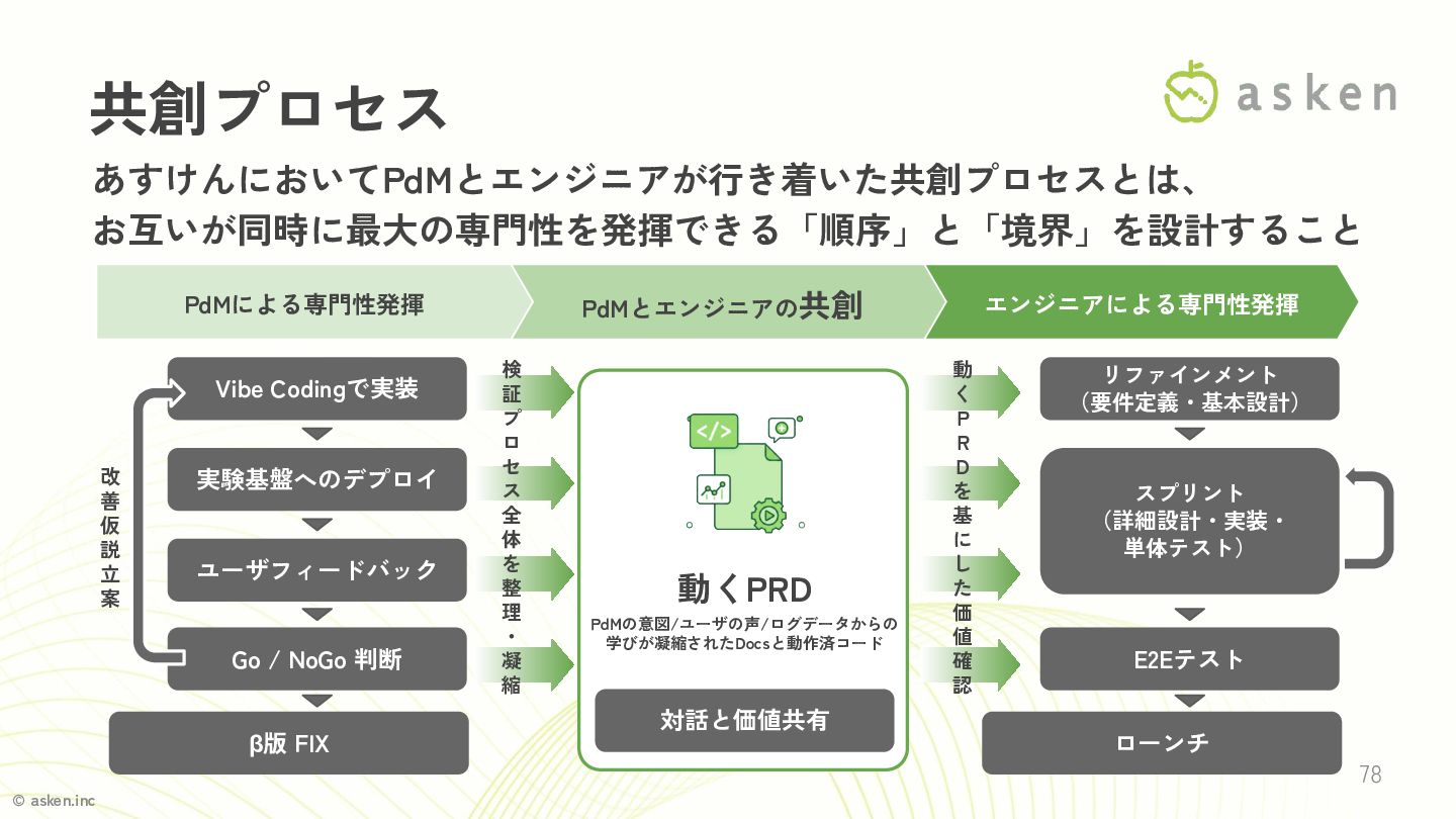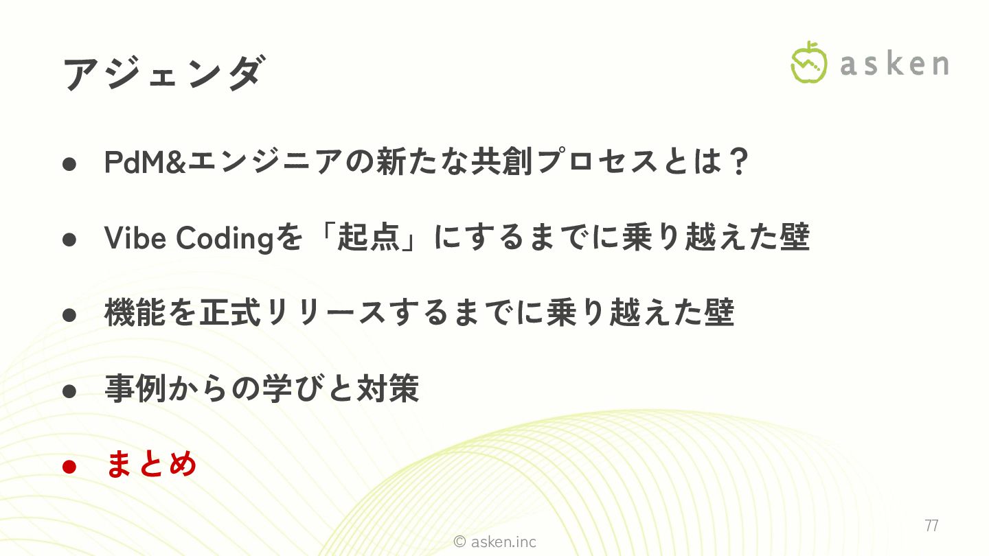 © asken.inc 77 • PdM&エンジニアの新たな共創プロセスとは? • Vibe Codingを「起点」にするまでに乗り越えた壁 • 機能を正式リリースするまでに乗り越えた壁