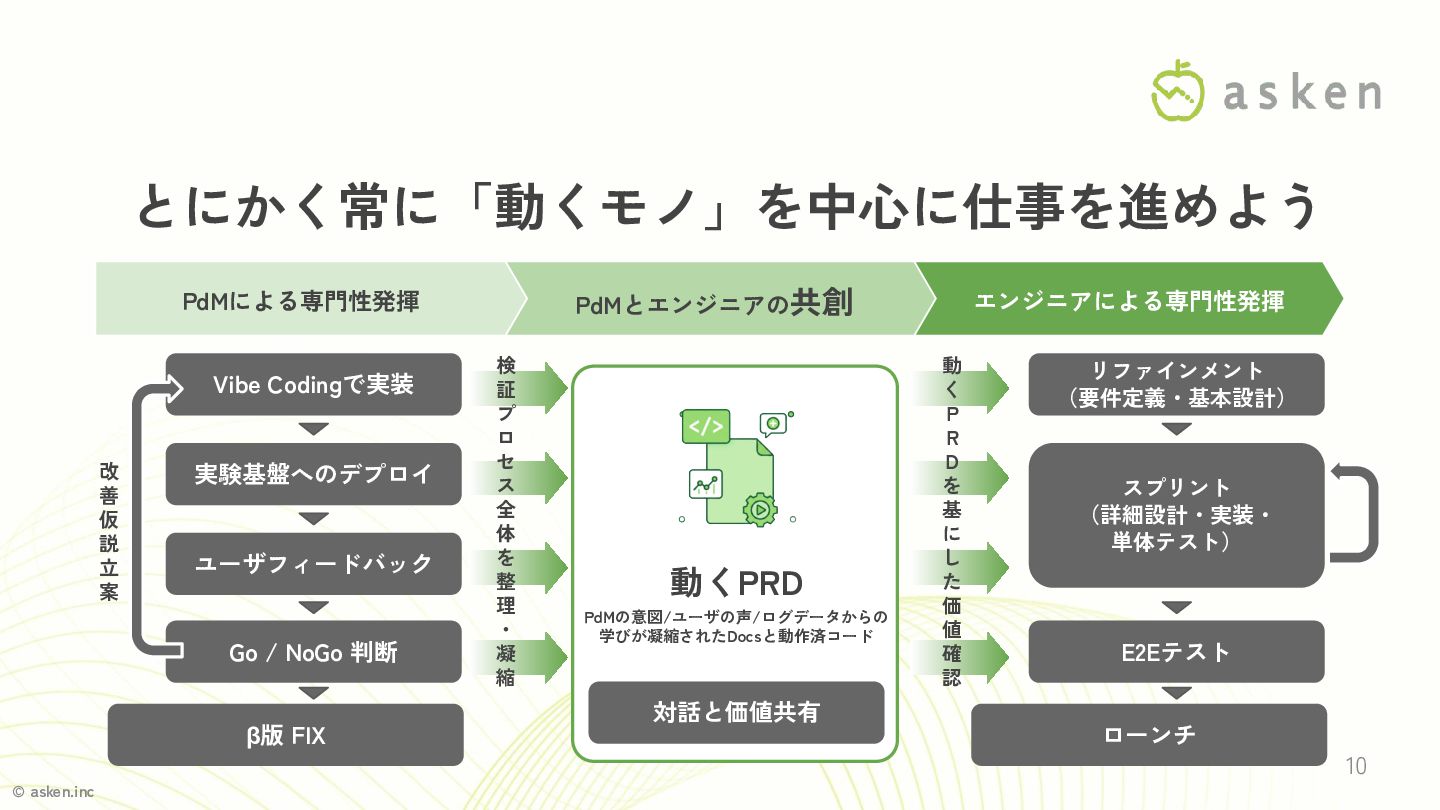 © asken.inc 9 • PdM&エンジニアの新たな共創プロセスとは? • Vibe Codingを「起点」にするまでに乗り越えた壁 • 機能を正式リリースするまでに乗り越えた壁