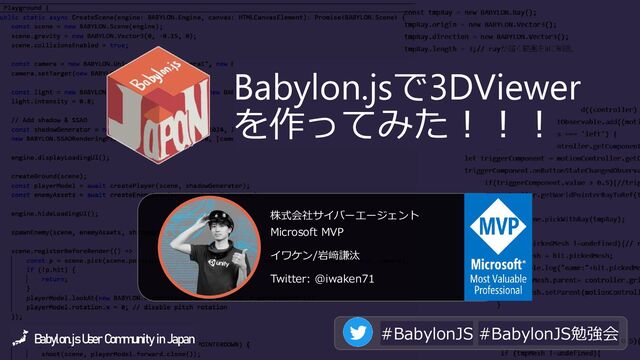 o イワケンのTwitterフォロー (@iwaken71) o 今回の3DViewer体験Webページ o https://iwaken71.github.io/BabylonJS3DViewerBasics/ o Babylon.jsのブログ記事をZennに書いてます! o https://zenn.dev/iwaken71 o 今回のコード:Github o https://github.com/iwaken71/BabylonJS3DViewerBasics