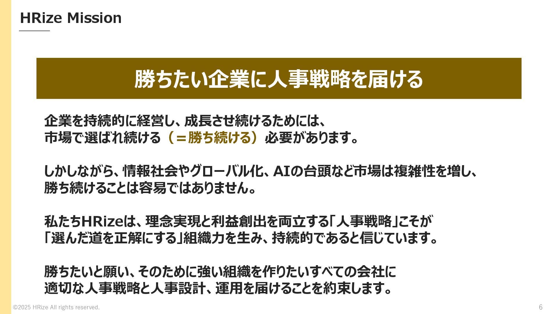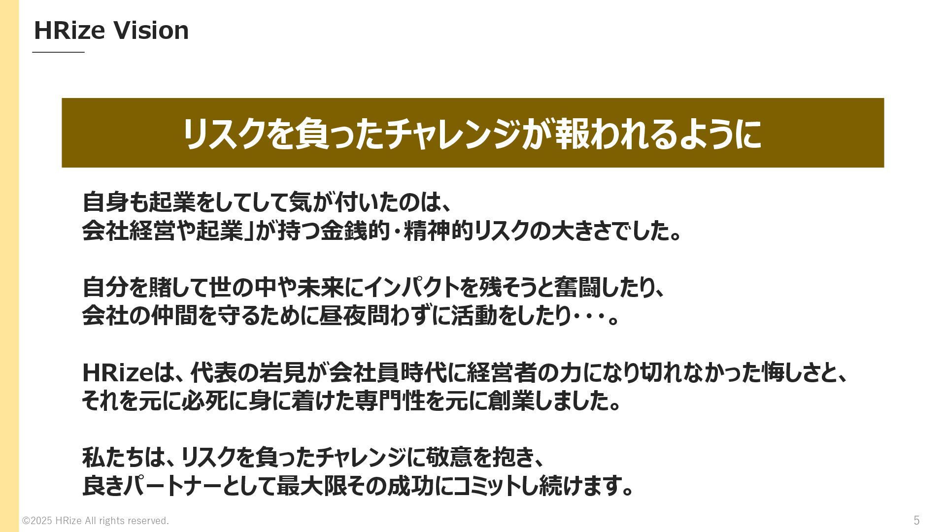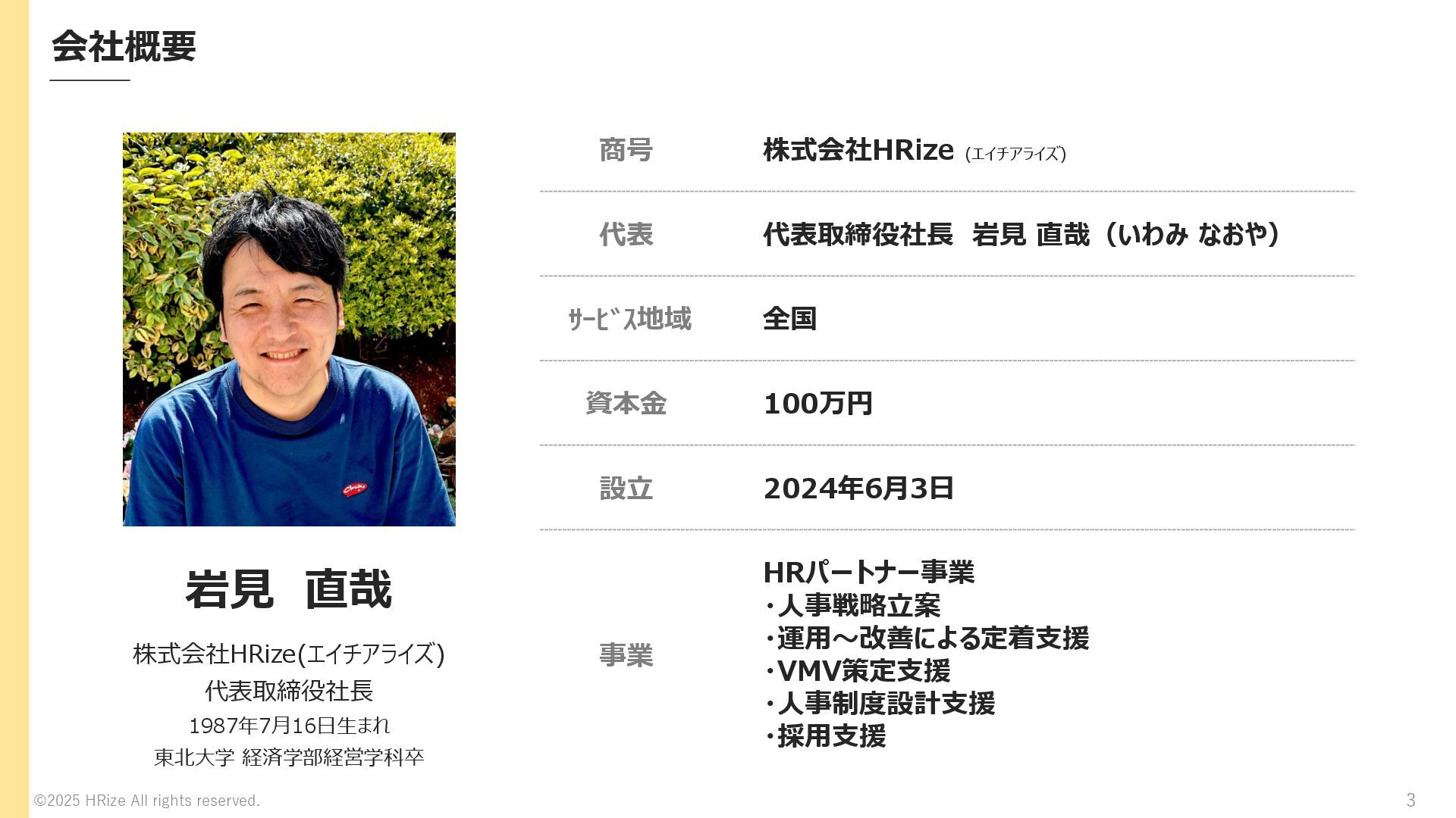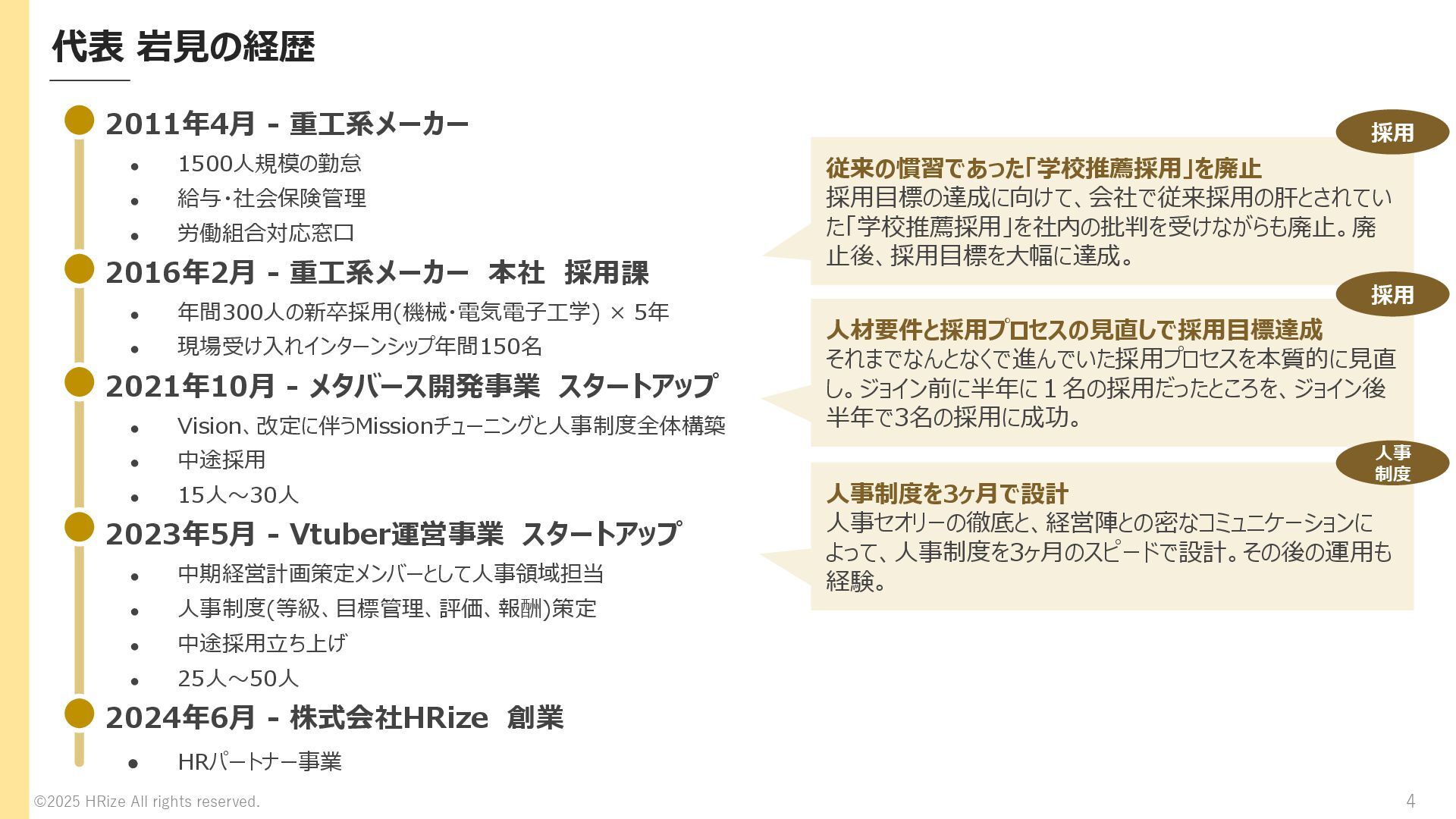 重工系メーカー • 1500人規模の勤怠 • 給与・社会保険管理 • 労働組合対応窓口 2016年2月 - 重工系メーカー 本社 採用課 • 年間300人の新卒採用(機械・電気電子工学) × 5年 • 現場受け入れインターンシップ年間150名 2021年10月 - メタバース開発事業 スタートアップ • Vision、改定に伴うMissionチューニングと人事制度全体構築 • 中途採用 • 15人~30人 2023年5月 - Vtuber運営事業 スタートアップ • 中期経営計画策定メンバーとして人事領域担当 • 人事制度(等級、目標管理、評価、報酬)策定 • 中途採用立ち上げ • 25人~50人 2024年6月 - 株式会社HRize 創業 • HRパートナー事業 従来の慣習であった「学校推薦採用」を廃止 採用目標の達成に向けて、会社で従来採用の肝とされてい た「学校推薦採用」を社内の批判を受けながらも廃止。廃 止後、採用目標を大幅に達成。 人事制度を3ヶ月で設計 人事セオリーの徹底と、経営陣との密なコミュニケーションに よって、人事制度を3ヶ月のスピードで設計。その後の運用も 経験。 人材要件と採用プロセスの見直しで採用目標達成 それまでなんとなくで進んでいた採用プロセスを本質的に見直 し。ジョイン前に半年に1名の採用だったところを、ジョイン後 半年で3名の採用に成功。 採用 採用 人事 制度