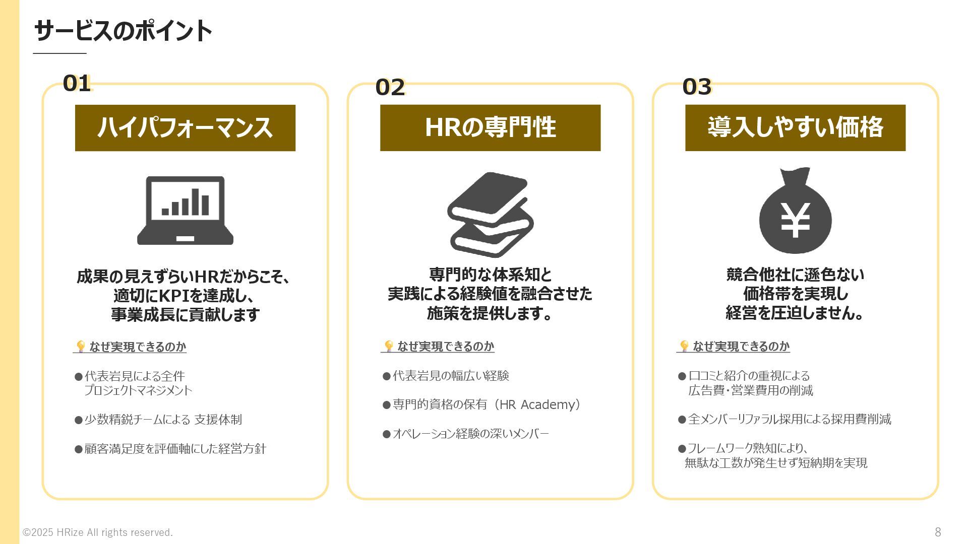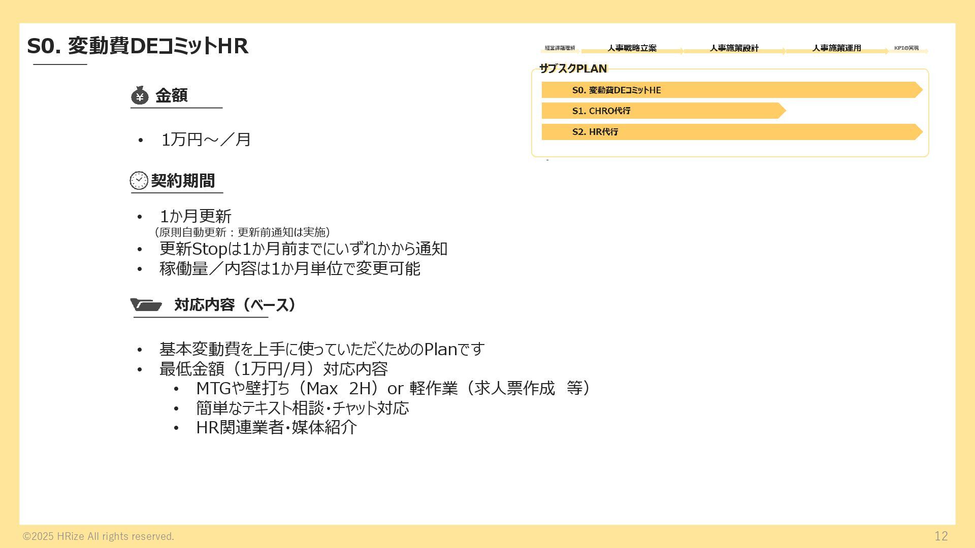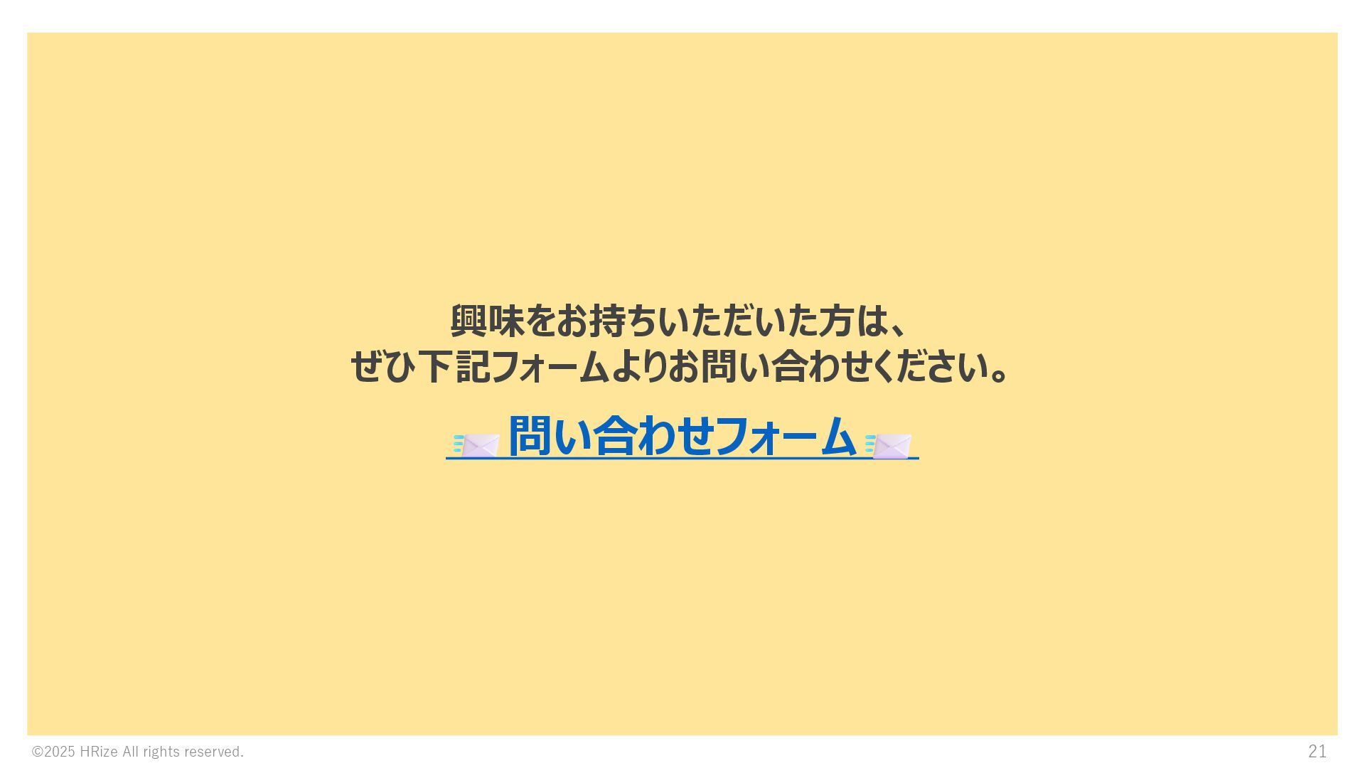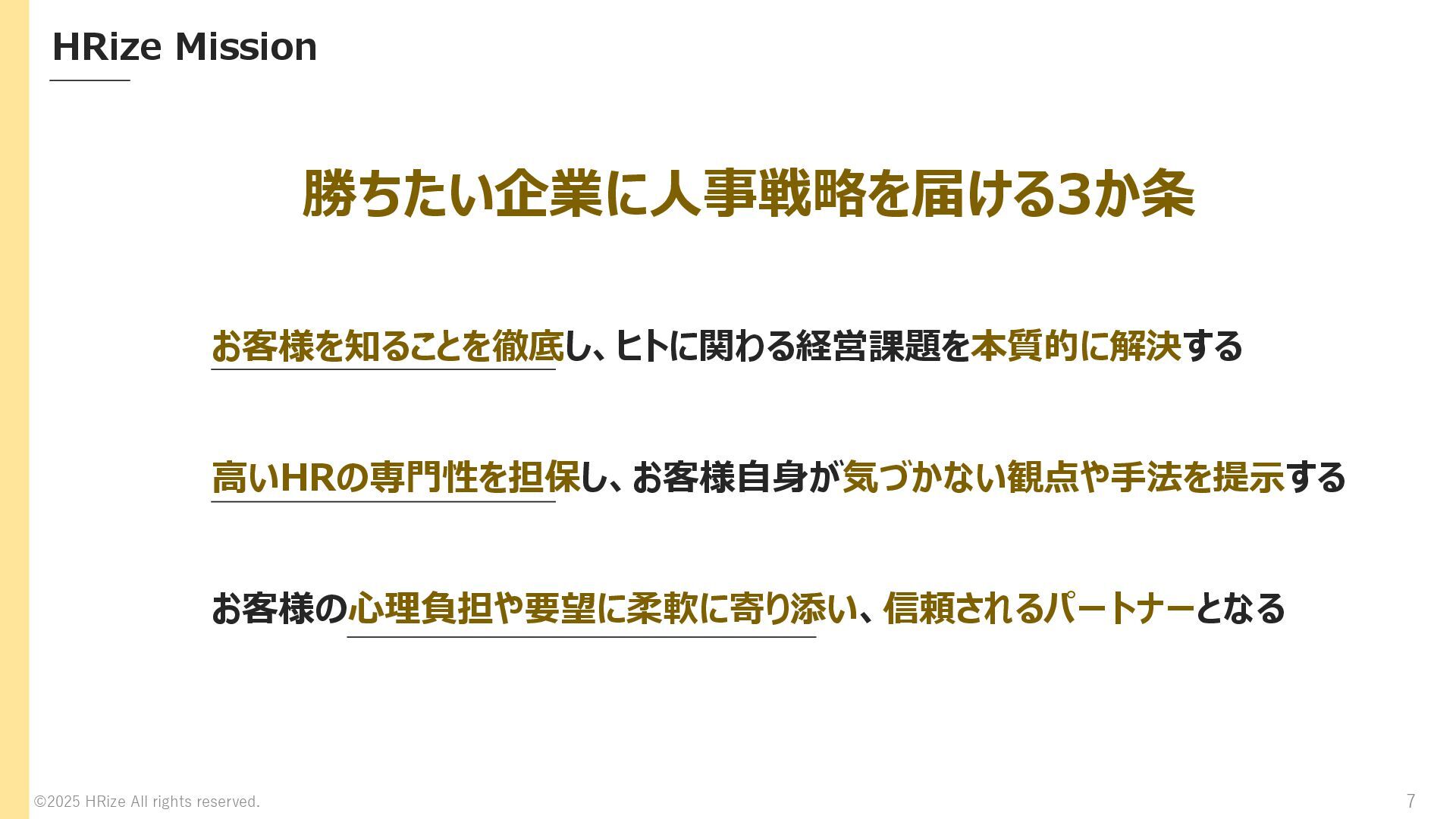 重工系メーカー • 1500人規模の勤怠 • 給与・社会保険管理 • 労働組合対応窓口 2016年2月 - 重工系メーカー 本社 採用課 • 年間300人の新卒採用(機械・電気電子工学) × 5年 • 現場受け入れインターンシップ年間150名 2021年10月 - メタバース開発事業 スタートアップ • Vision、改定に伴うMissionチューニングと人事制度全体構築 • 中途採用 • 15人~30人 2023年5月 - Vtuber運営事業 スタートアップ • 中期経営計画策定メンバーとして人事領域担当 • 人事制度(等級、目標管理、評価、報酬)策定 • 中途採用立ち上げ • 25人~50人 2024年6月 - 株式会社HRize 創業 • HRパートナー事業 従来の慣習であった「学校推薦採用」を廃止 採用目標の達成に向けて、会社で従来採用の肝とされてい た「学校推薦採用」を社内の批判を受けながらも廃止。廃 止後、採用目標を大幅に達成。 人事制度を3ヶ月で設計 人事セオリーの徹底と、経営陣との密なコミュニケーションに よって、人事制度を3ヶ月のスピードで設計。その後の運用も 経験。 人材要件と採用プロセスの見直しで採用目標達成 それまでなんとなくで進んでいた採用プロセスを本質的に見直 し。ジョイン前に半年に1名の採用だったところを、ジョイン後 半年で3名の採用に成功。 採用 採用 人事 制度