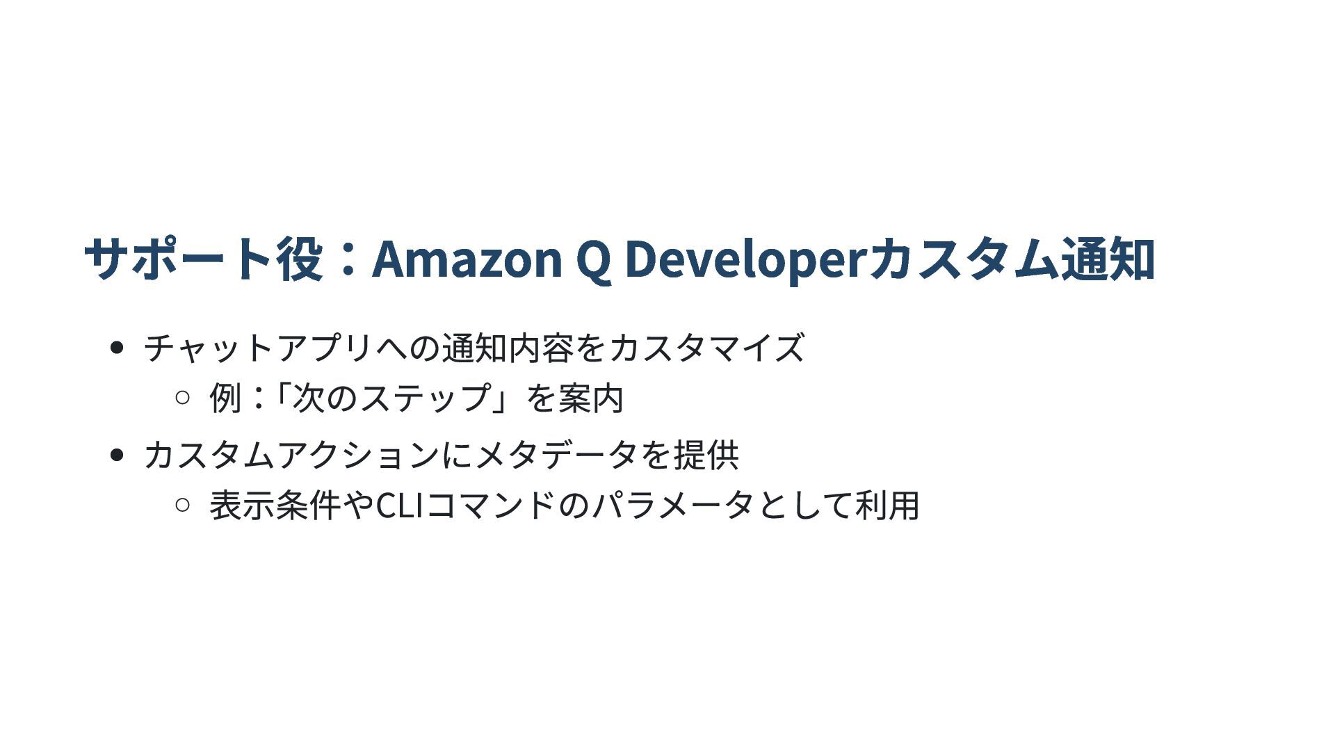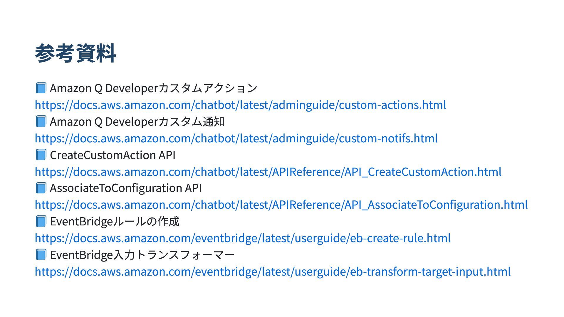 7. 参考資料 Amazon Q Developerカスタムアクション https://docs.aws.amazon.com/chatbot/latest/adminguide/custom-actions.html Amazon Q Developerカスタム通知 https://docs.aws.amazon.com/chatbot/latest/adminguide/custom-notifs.html CreateCustomAction