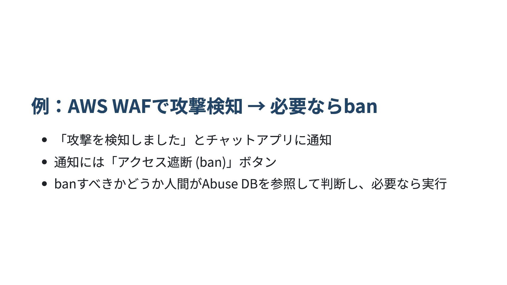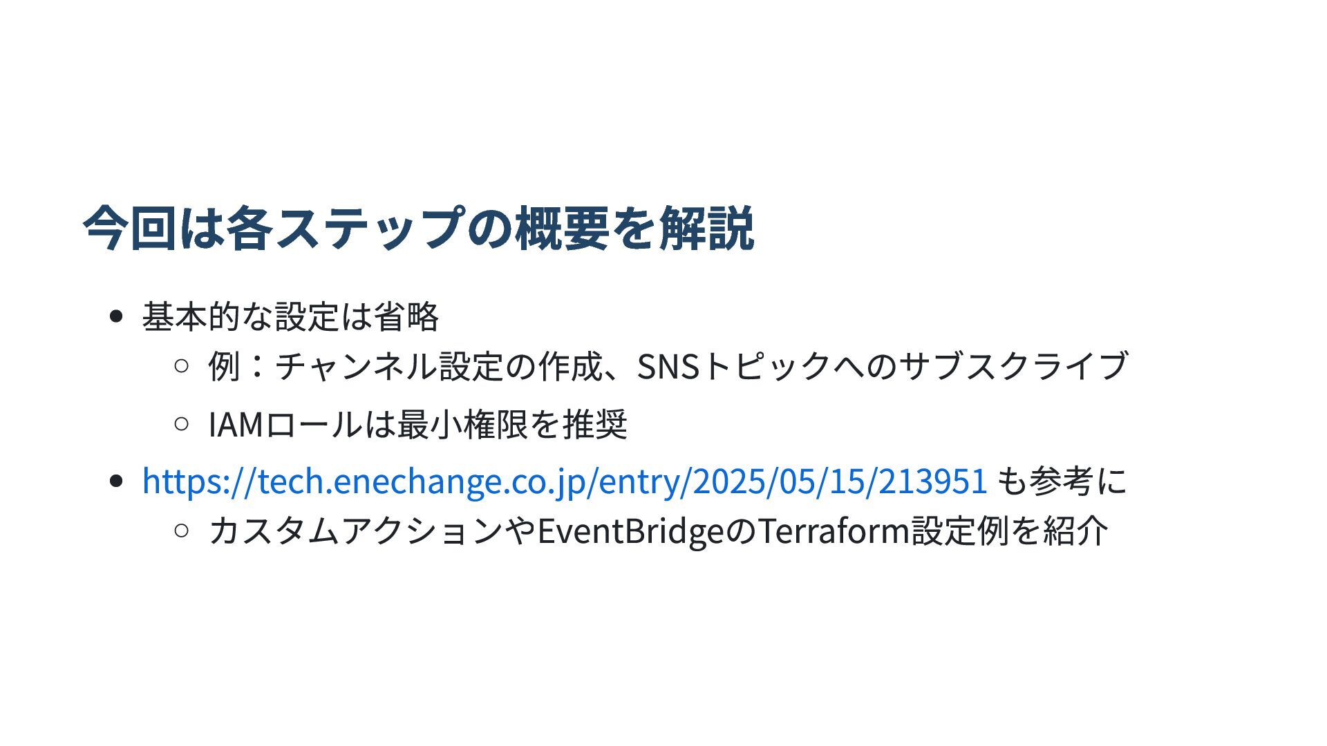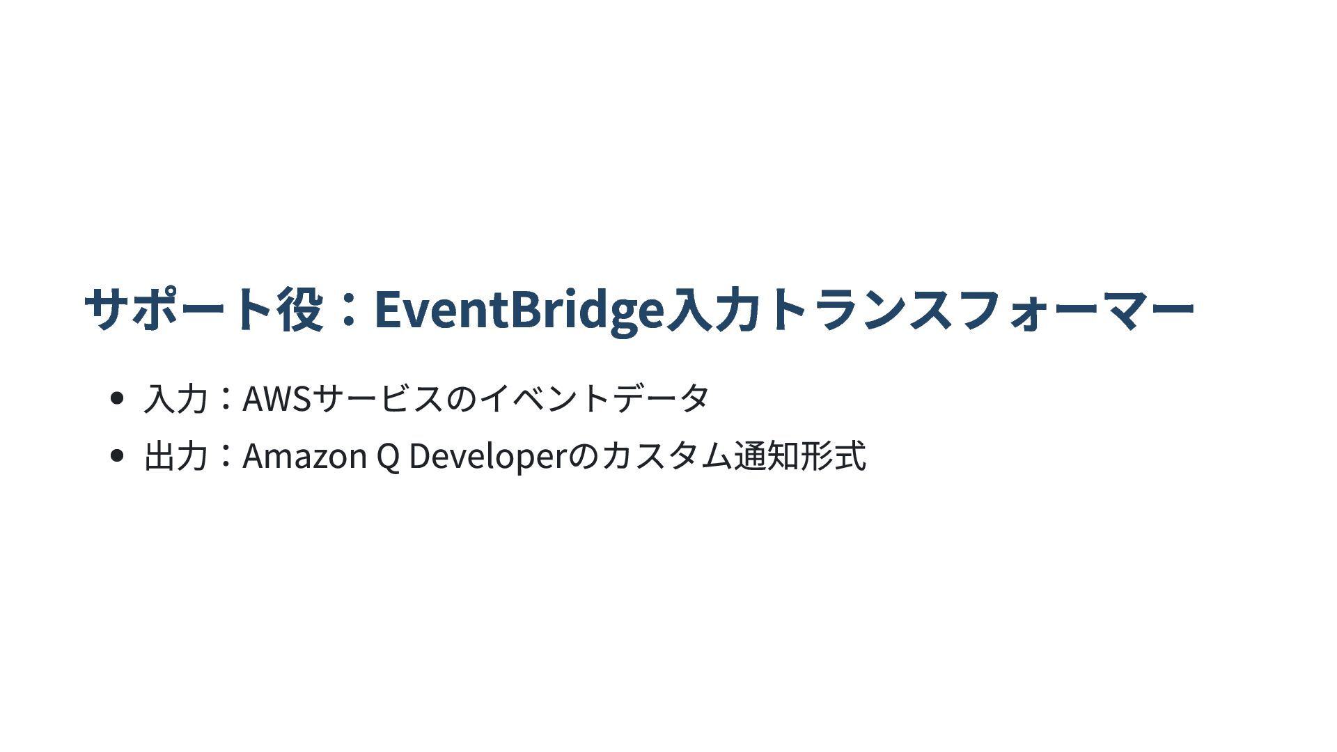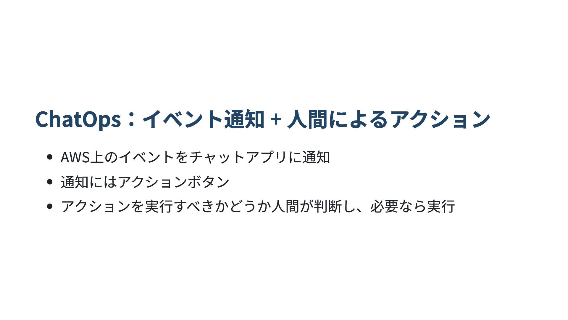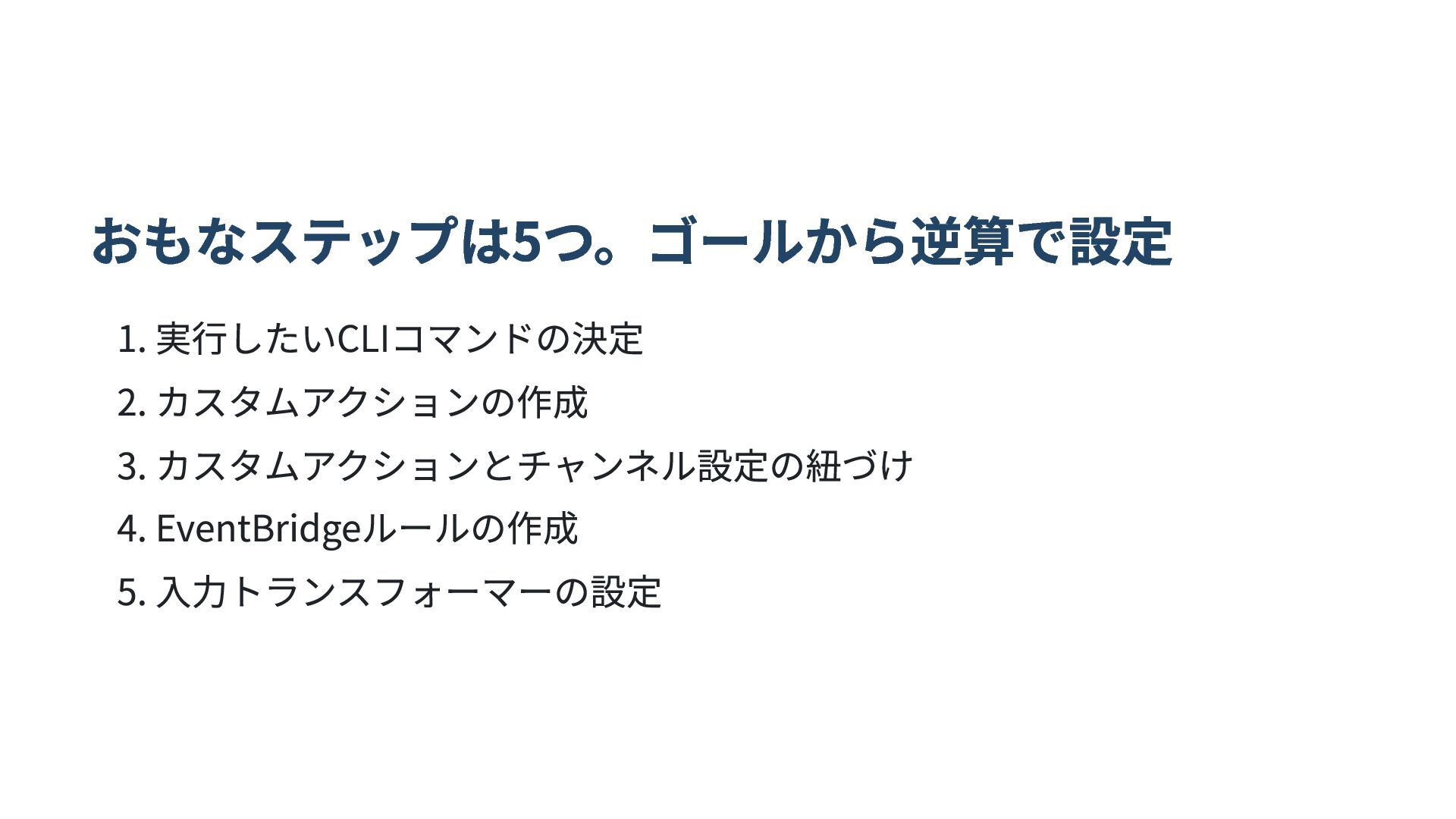 API https://docs.aws.amazon.com/chatbot/latest/APIReference/API_CreateCustomAction.html AssociateToConfiguration API https://docs.aws.amazon.com/chatbot/latest/APIReference/API_AssociateToConfiguration.html EventBridgeルールの作成 https://docs.aws.amazon.com/eventbridge/latest/userguide/eb-create-rule.html EventBridge入力トランスフォーマー https://docs.aws.amazon.com/eventbridge/latest/userguide/eb-transform-target-input.html