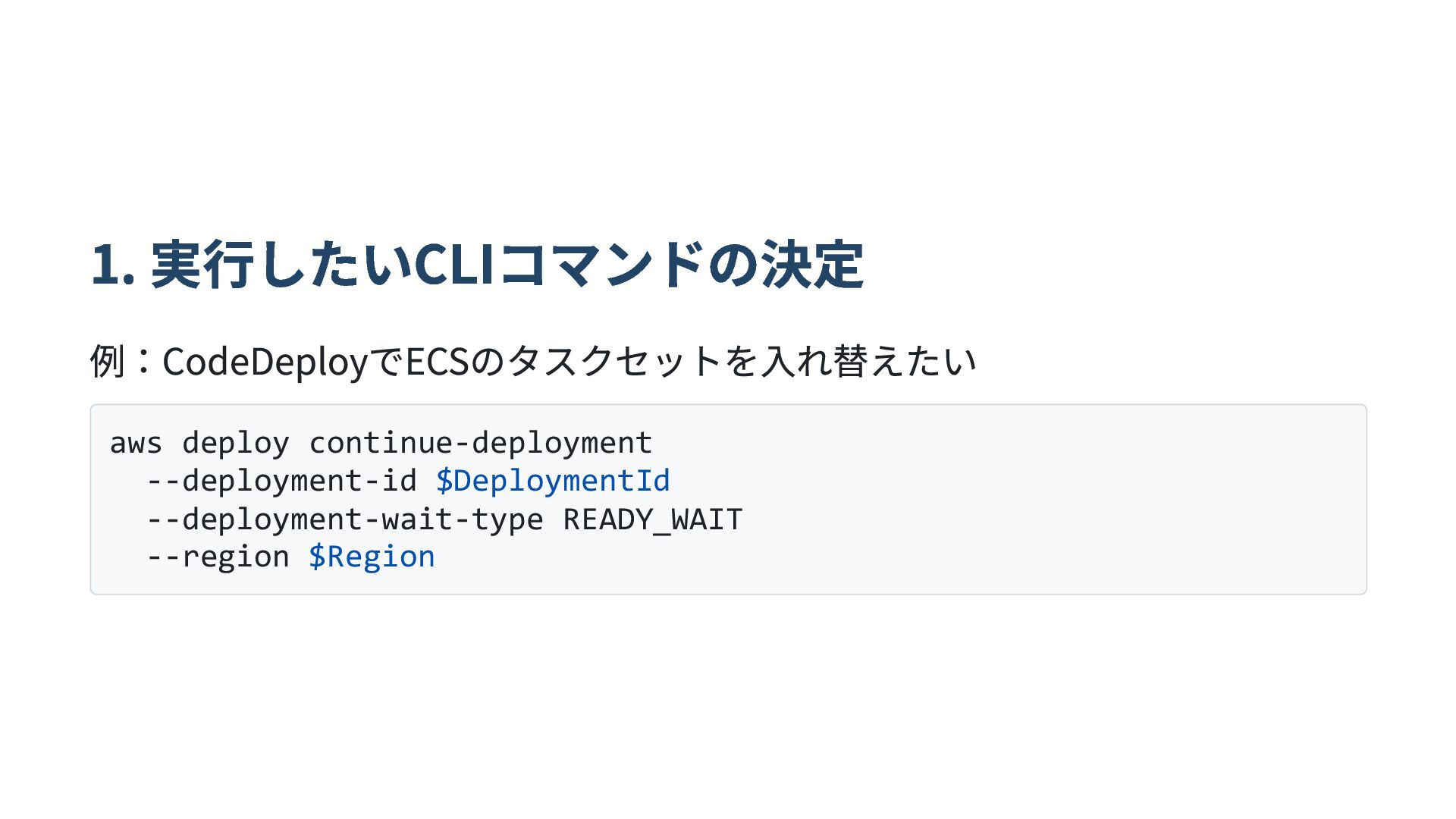 3. 参考:input.json の例 { "Definition": { "CommandText": "codedeploy continue-deployment --deployment-id $DeploymentId