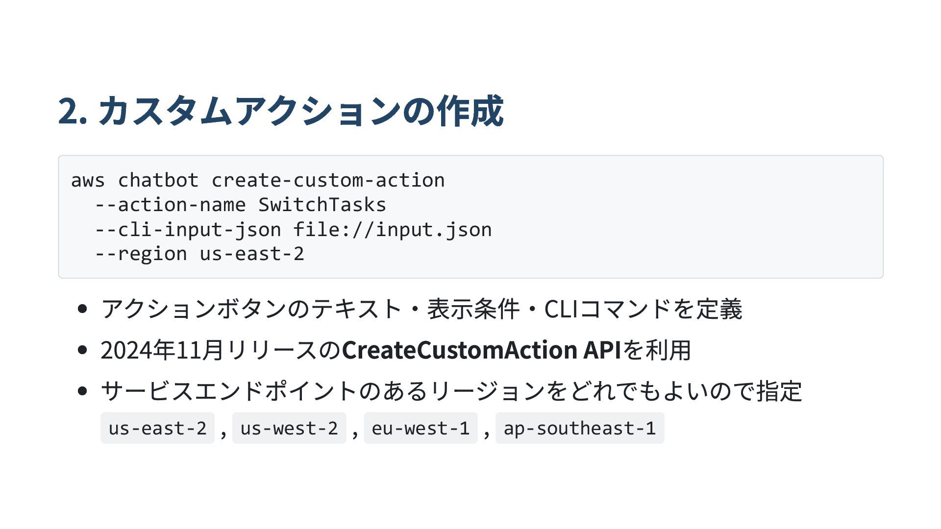 2. 2. カスタムアクションの作成 aws chatbot create-custom-action --action-name SwitchTasks --cli-input-json file://input.json --region