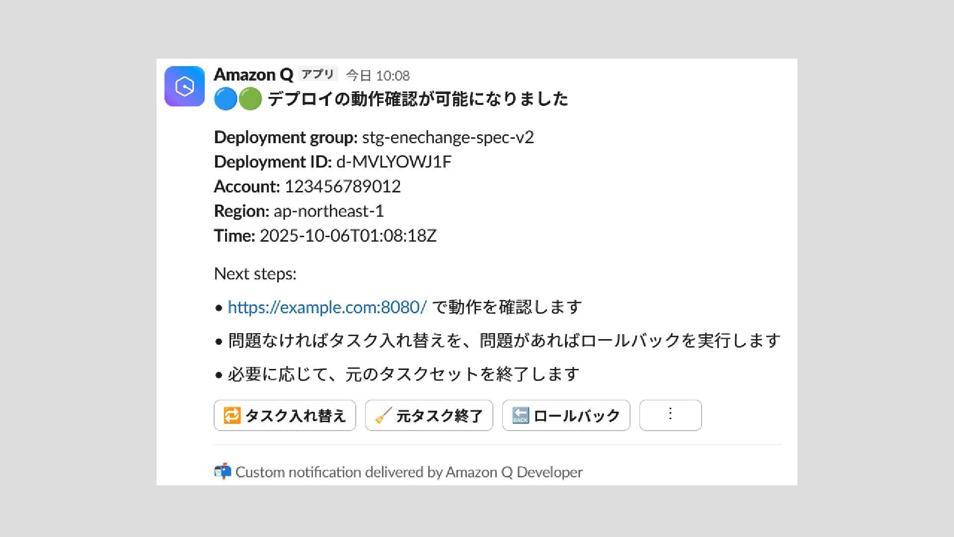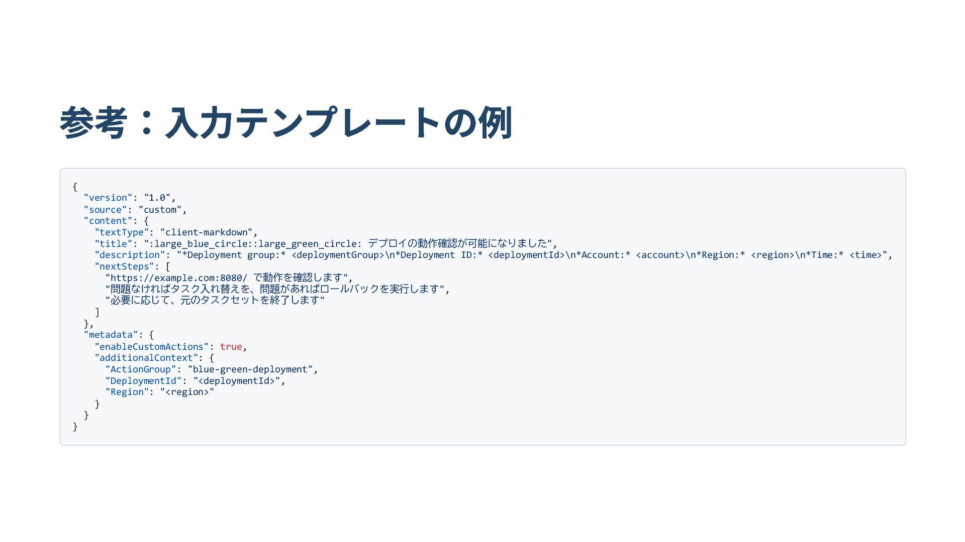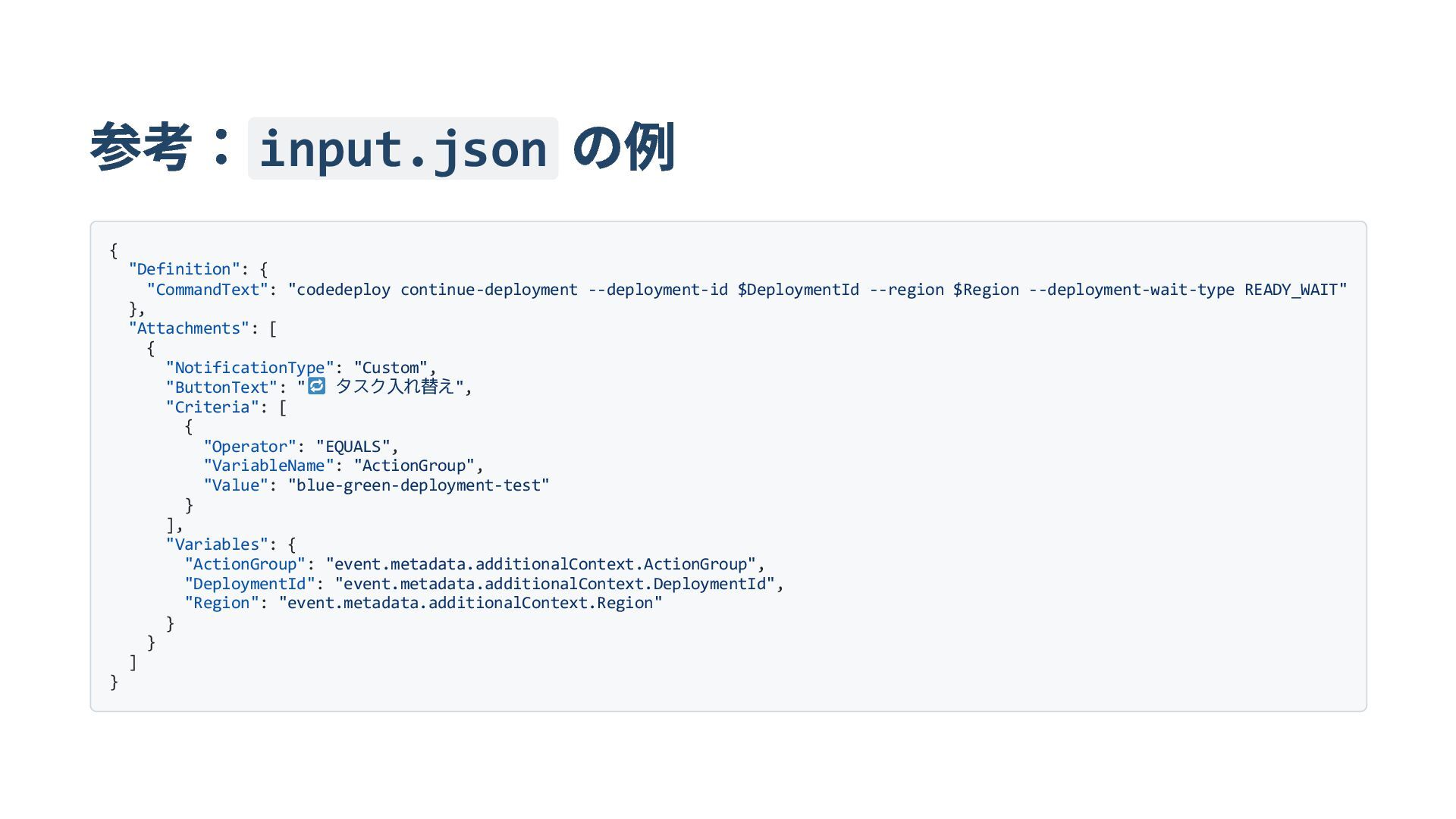 --region $Region --deployment-wait-type READY_WAIT" }, "Attachments": [ { "NotificationType": "Custom", "ButtonText": " タスク入れ替え", "Criteria": [ { "Operator": "EQUALS", "VariableName": "ActionGroup", "Value": "blue-green-deployment-test" } ], "Variables": { "ActionGroup": "event.metadata.additionalContext.ActionGroup", "DeploymentId": "event.metadata.additionalContext.DeploymentId", "Region": "event.metadata.additionalContext.Region" } } ] }