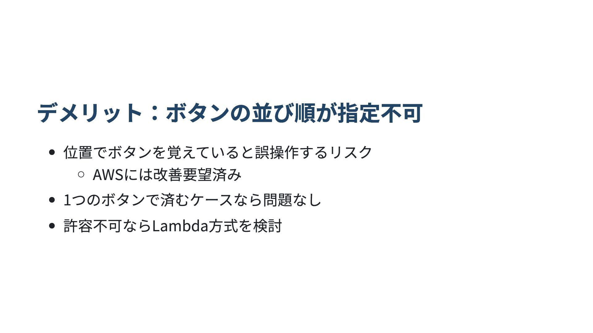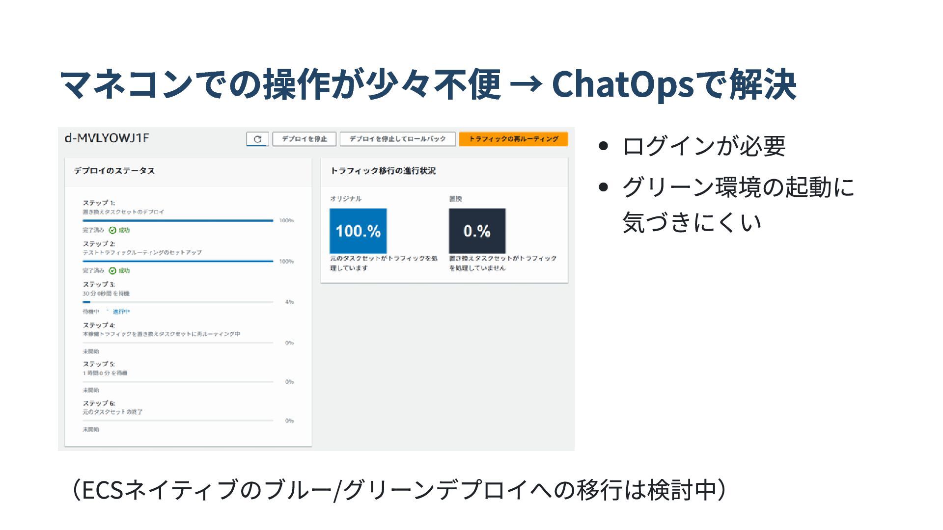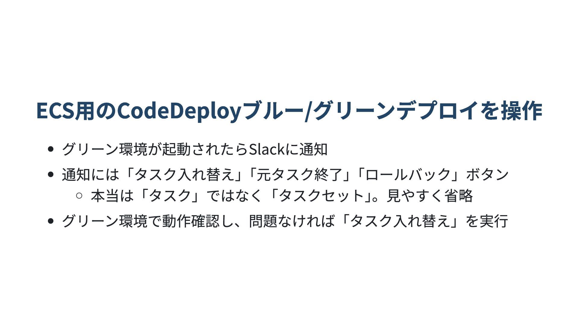 --region $Region --deployment-wait-type READY_WAIT" }, "Attachments": [ { "NotificationType": "Custom", "ButtonText": " タスク入れ替え", "Criteria": [ { "Operator": "EQUALS", "VariableName": "ActionGroup", "Value": "blue-green-deployment-test" } ], "Variables": { "ActionGroup": "event.metadata.additionalContext.ActionGroup", "DeploymentId": "event.metadata.additionalContext.DeploymentId", "Region": "event.metadata.additionalContext.Region" } } ] }