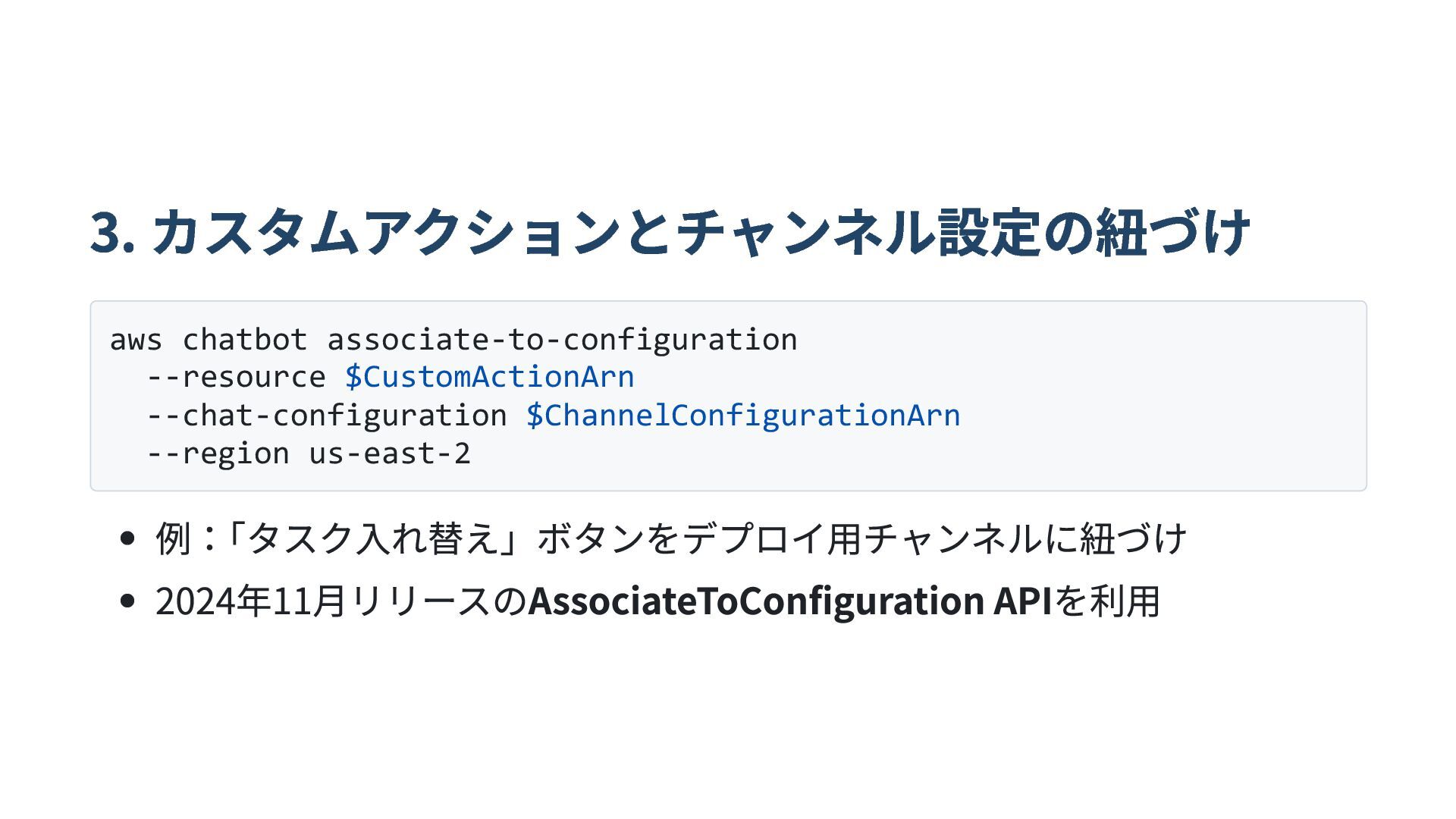 4. 3. カスタムアクションとチャンネル設定の紐づけ aws chatbot associate-to-configuration --resource $CustomActionArn --chat-configuration $ChannelConfigurationArn --region