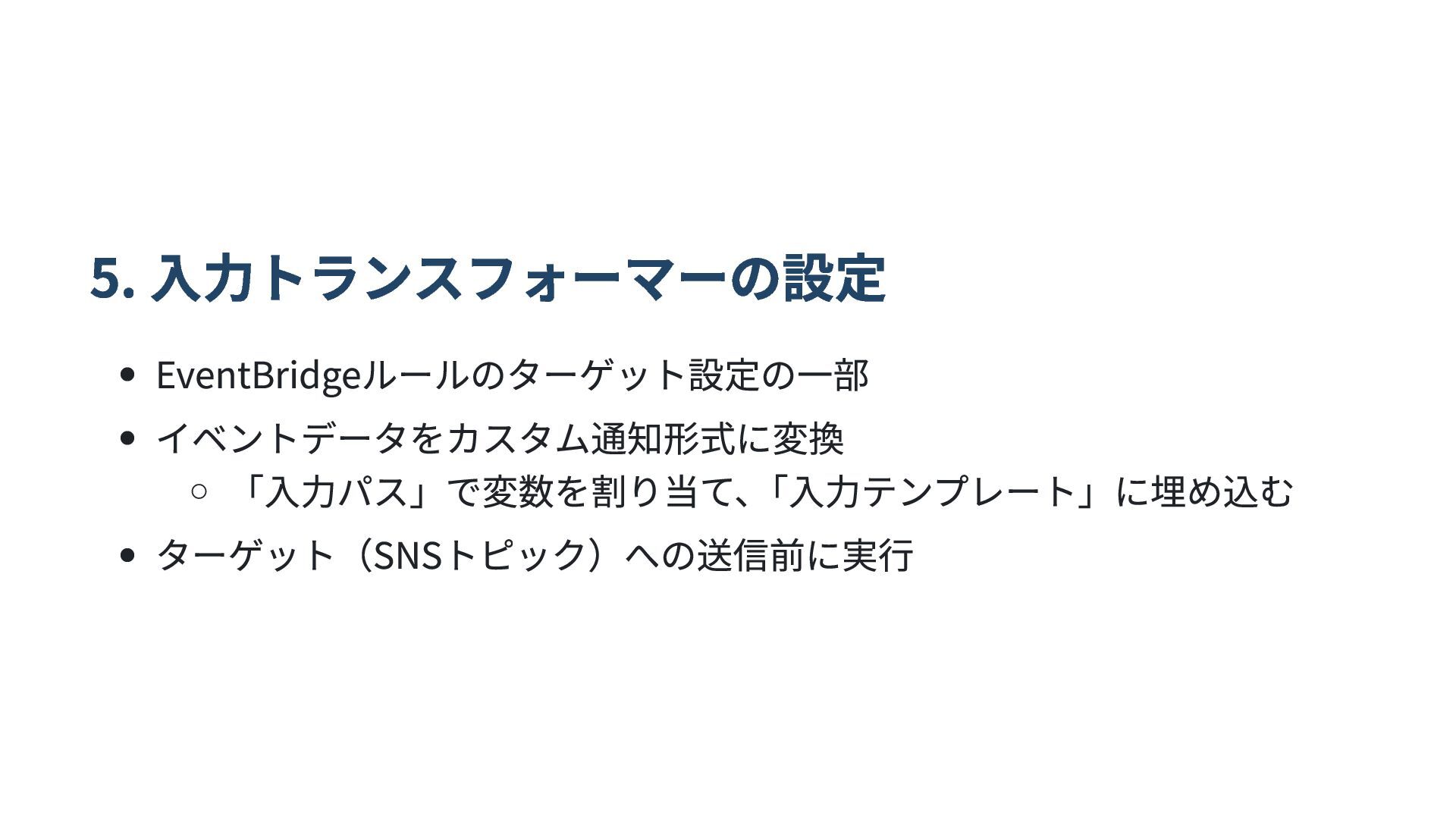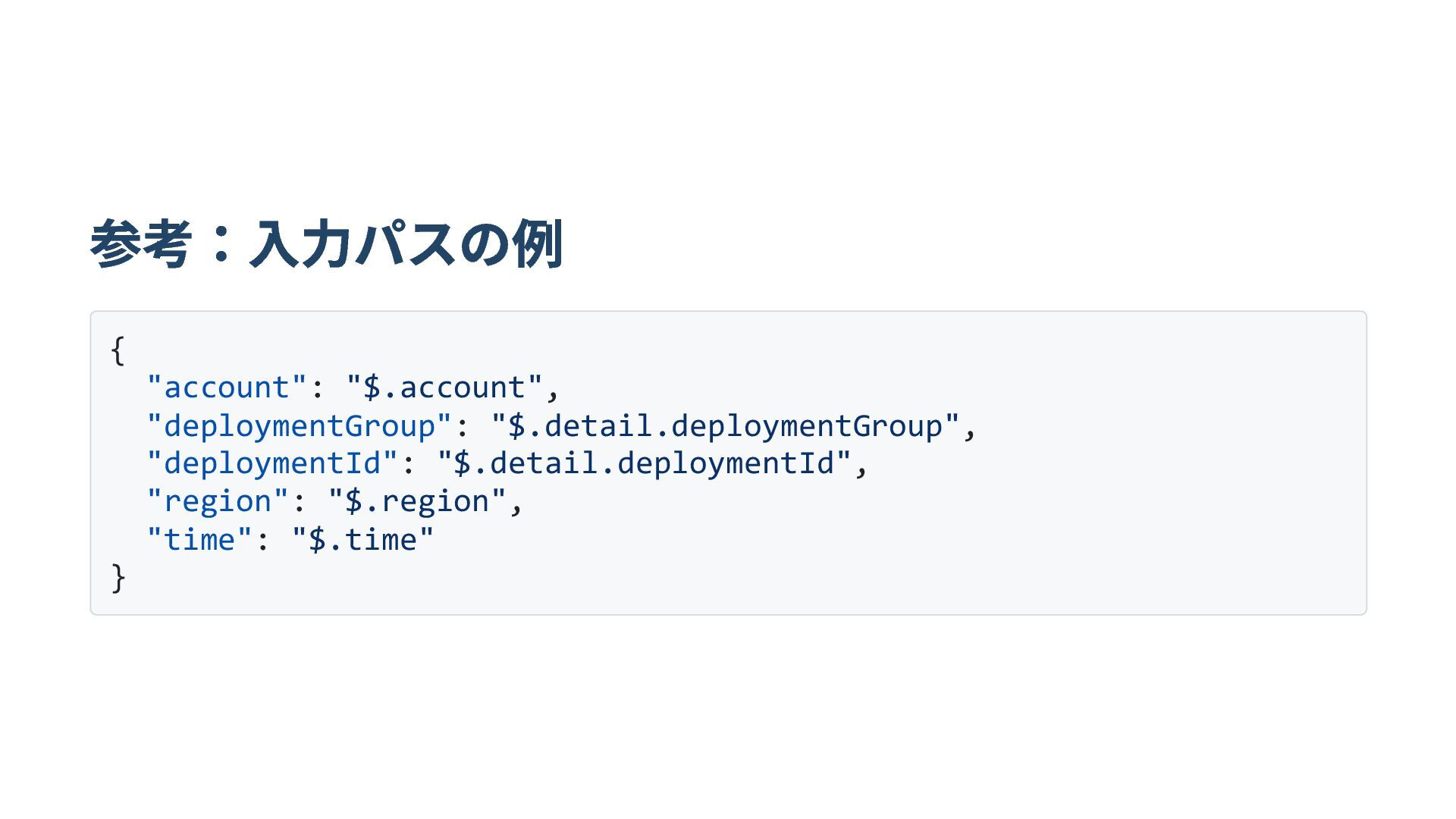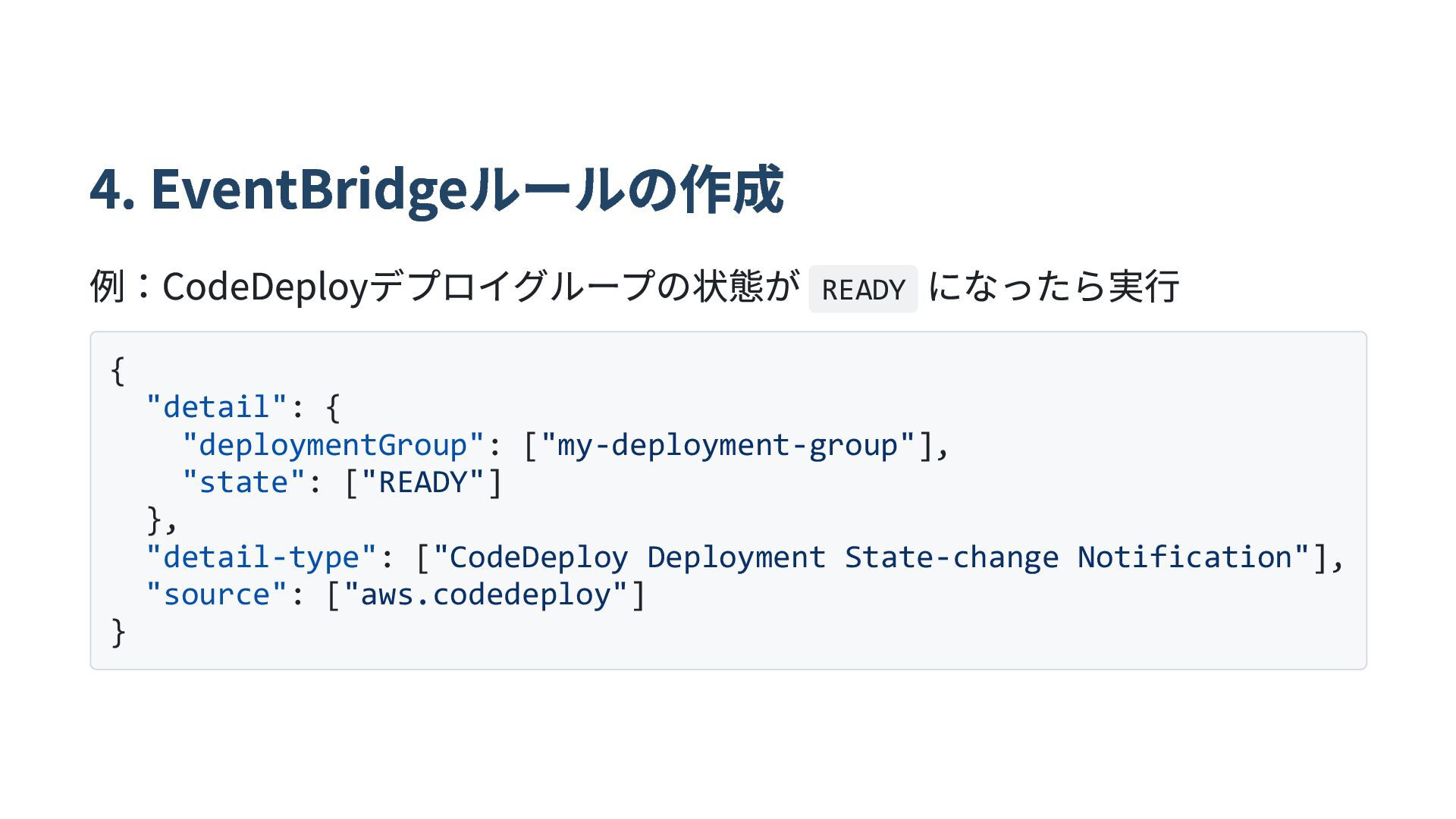 5. 4. EventBridgeルールの作成 例:CodeDeployデプロイグループの状態が READY になったら実行 { "detail": { "deploymentGroup": ["my-deployment-group"],