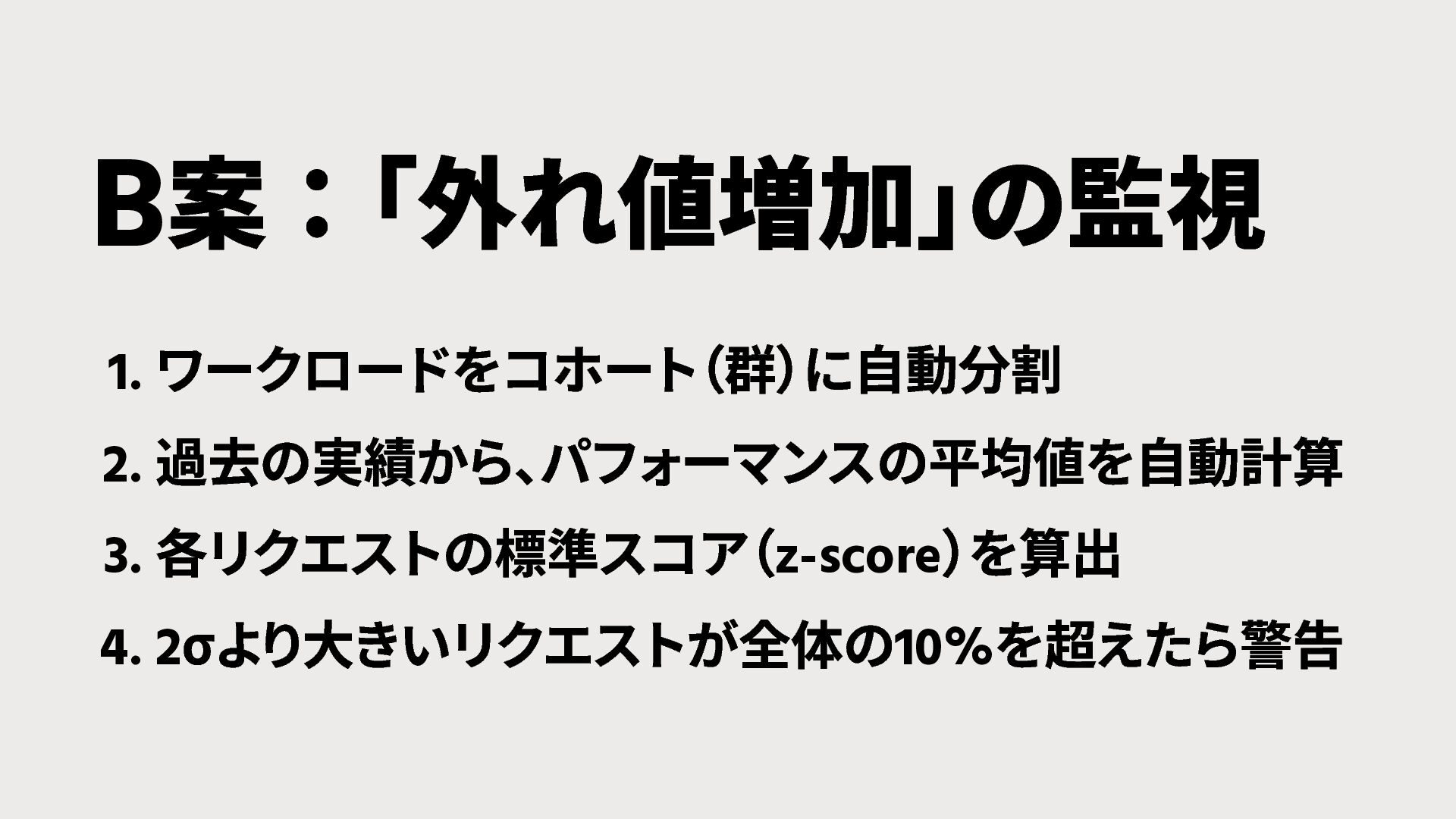 パフォーマンスの平均値を自動計算 3. 各リクエストの標準スコア (z-score ) を算出 4. 2 σより大きいリクエストが全体の10% を超えたら警告 B