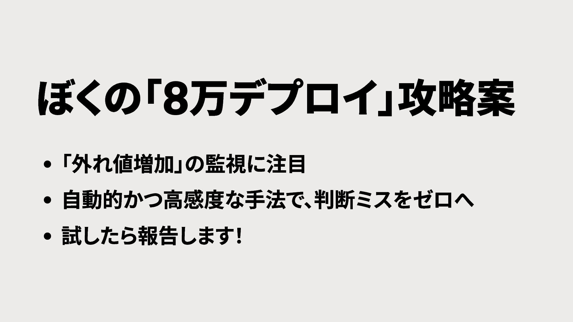 ぼくの 「 万デプロイ」 攻略案 「外れ値増加」 の監視に注目 自動的かつ高感度な手法で、 判断ミスをゼロへ 試したら報告します! 8
