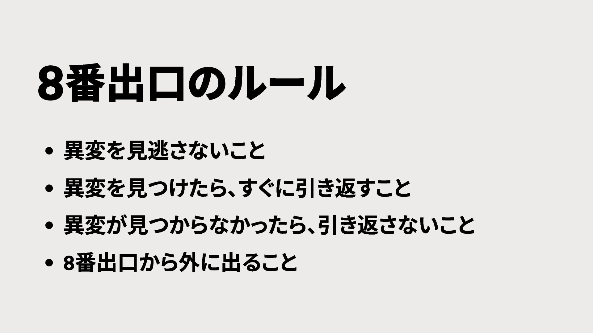 番出口のルール 異変を見逃さないこと 異変を見つけたら、 すぐに引き返すこと 異変が見つからなかったら、 引き返さないこと 8 番出口から外に出ること 8