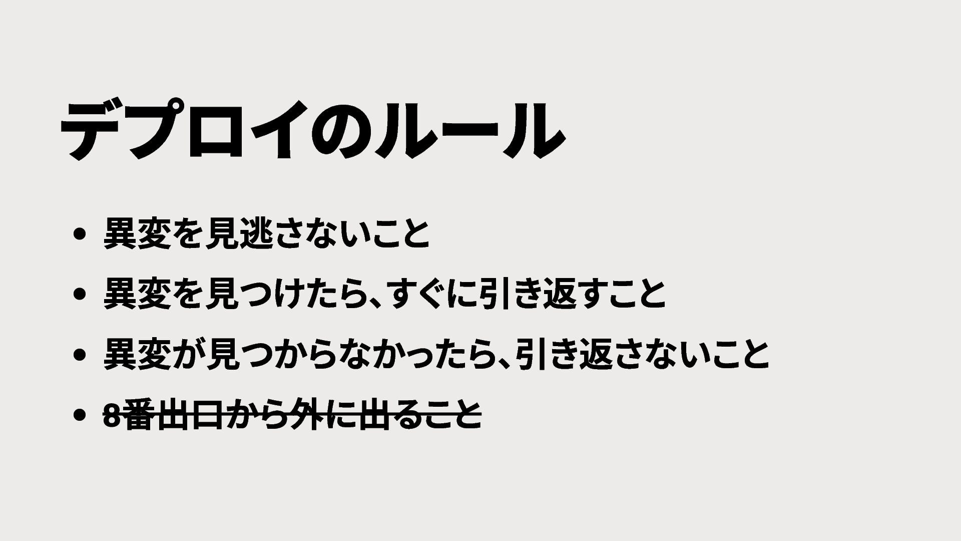 デプロイのルール 異変を見逃さないこと 異変を見つけたら、 すぐに引き返すこと 異変が見つからなかったら、 引き返さないこと 8 番出口から外に出ること