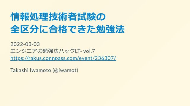 情報処理技術者試験の 全区分に合格できた勉強法 2022-03-03 エンジニアの勉強法ハックLT- vol.7 https://rakus.connpass.com/event/236307/ Takashi Iwamoto (@iwamot)