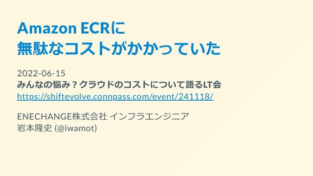 Amazon ECRに 無駄なコストがかかっていた 2022-06-15 みんなの悩み?クラウドのコストについて語るLT会 https://shiftevolve.connpass.com/event/241118/ ENECHANGE株式会社 インフラエンジニア 岩本隆史 (@iwamot)