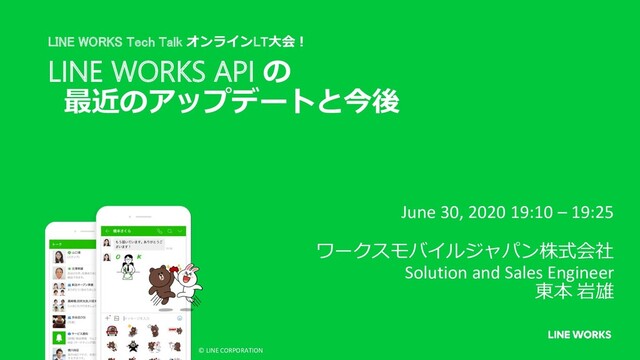 19:25 ワークスモバイルジャパン株式会社 Solution and Sales Engineer 東本 岩雄 © LINE CORPORATION LINE WORKS Tech Talk オンラインLT大会!