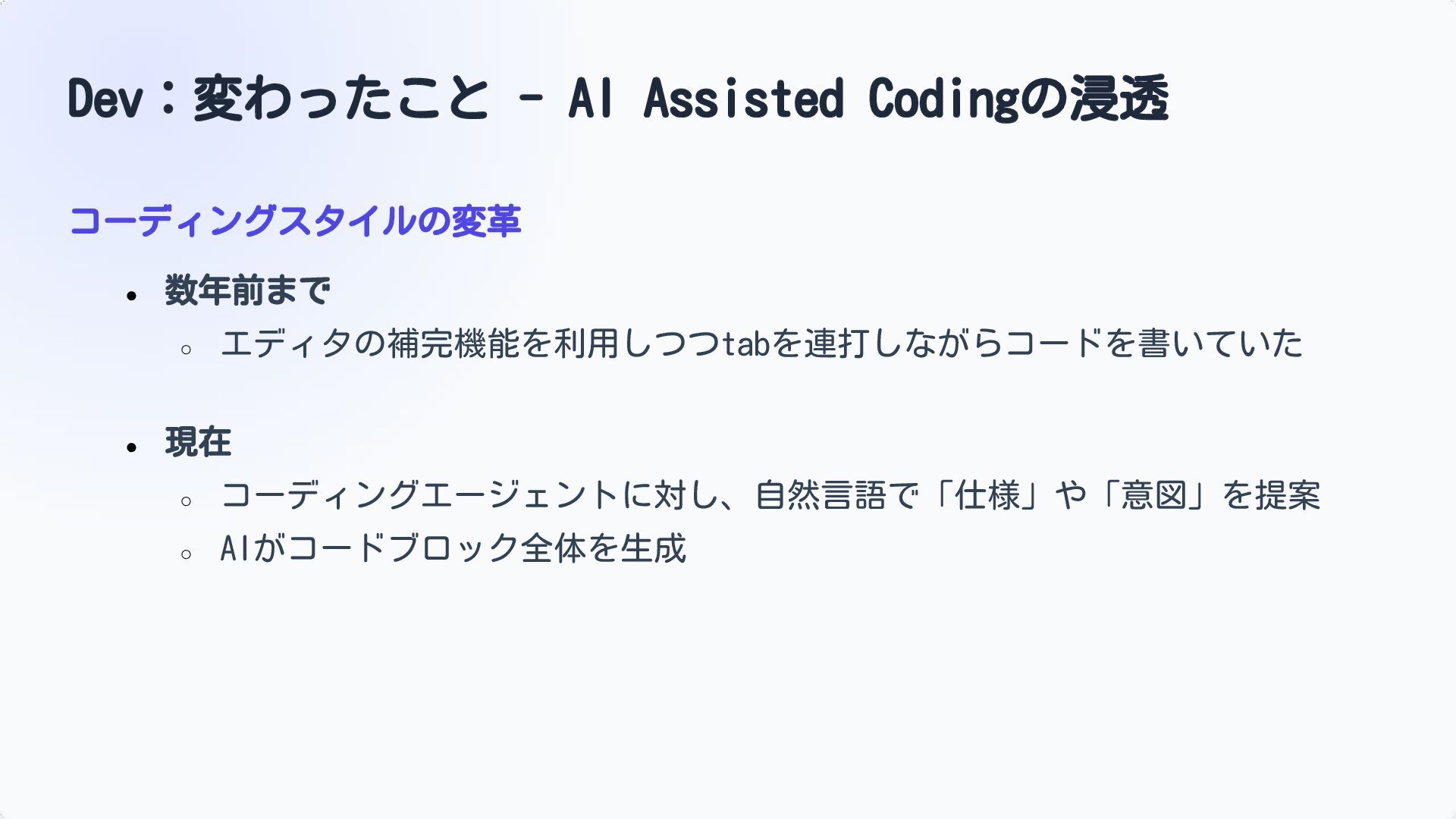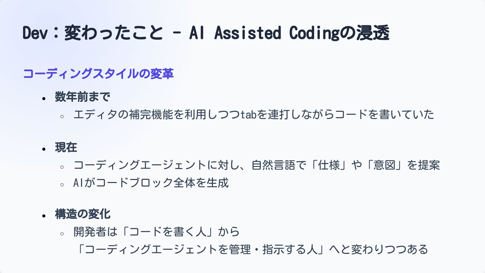 AIがコードブロック全体を生成 • 構造の変化 ◦ 開発者は「コードを書く人」から 「コーディングエージェントを管理・指示する人」へと変わりつつある Dev:変わったこと - AI Assisted Codingの浸透
