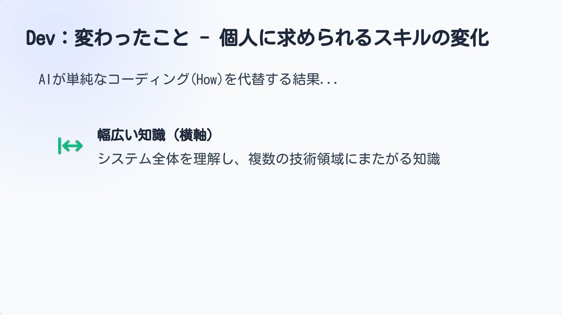 AIが単純なコーディング(How)を代替する結果... 幅広い知識(横軸) システム全体を理解し、複数の技術領域にまたがる知識 Dev:変わったこと - 個人に求められるスキルの変化