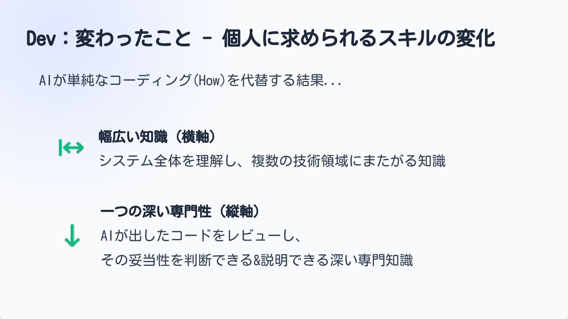 AIが単純なコーディング(How)を代替する結果... 幅広い知識(横軸) システム全体を理解し、複数の技術領域にまたがる知識 一つの深い専門性(縦軸) AIが出したコードをレビューし、 その妥当性を判断できる&説明できる深い専門知識 Dev:変わったこと - 個人に求められるスキルの変化