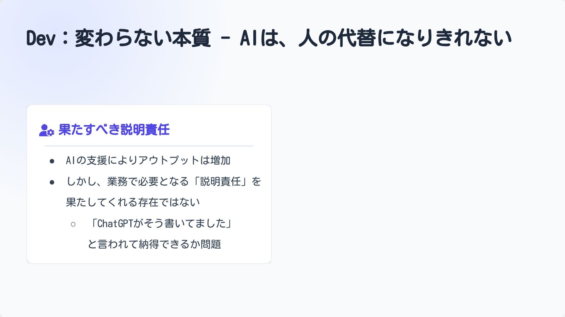 果たすべき説明責任 • AIの支援によりアウトプットは増加 • しかし、業務で必要となる「説明責任」を 果たしてくれる存在ではない ◦ 「ChatGPTがそう書いてました」 と言われて納得できるか問題 Dev:変わらない本質