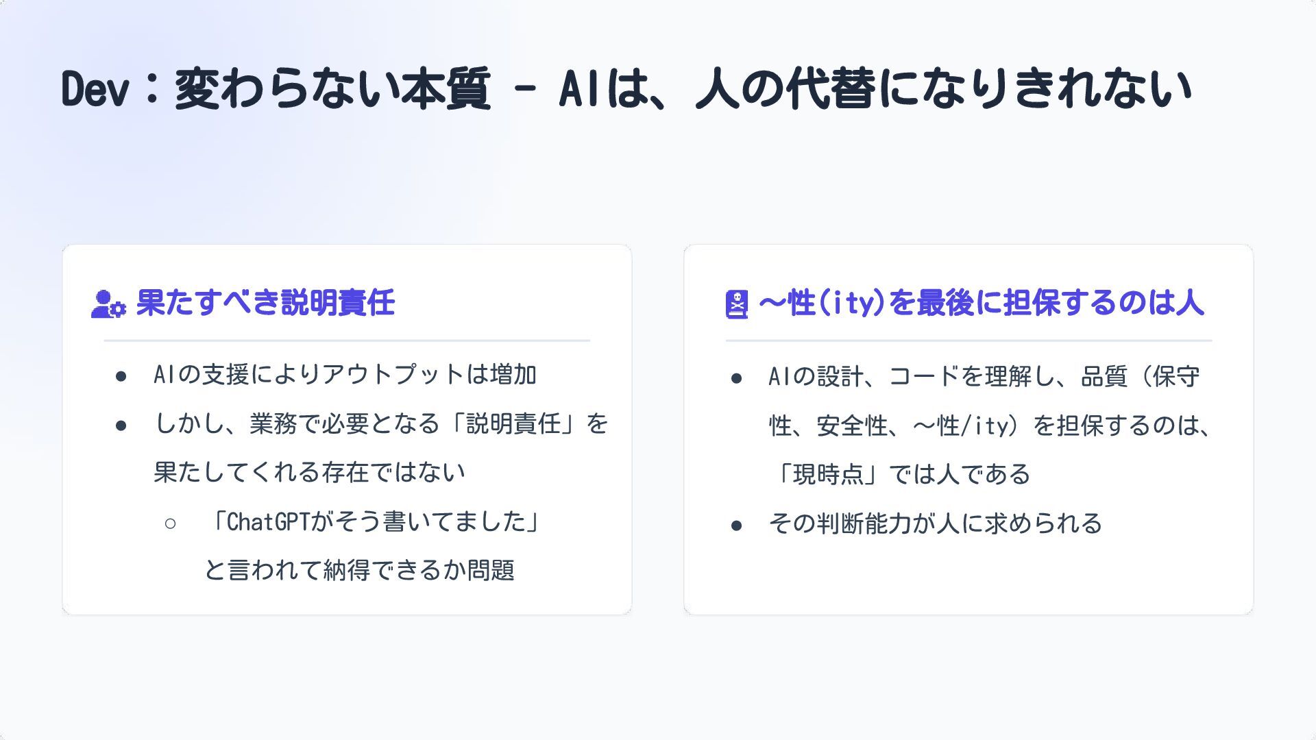 Dev:変わらない本質 - AIは、人の代替になりきれない • AIの設計、コードを理解し、品質(保守 性、安全性、〜性/ity)を担保するのは、 「現時点」では人である • その判断能力が人に求められる