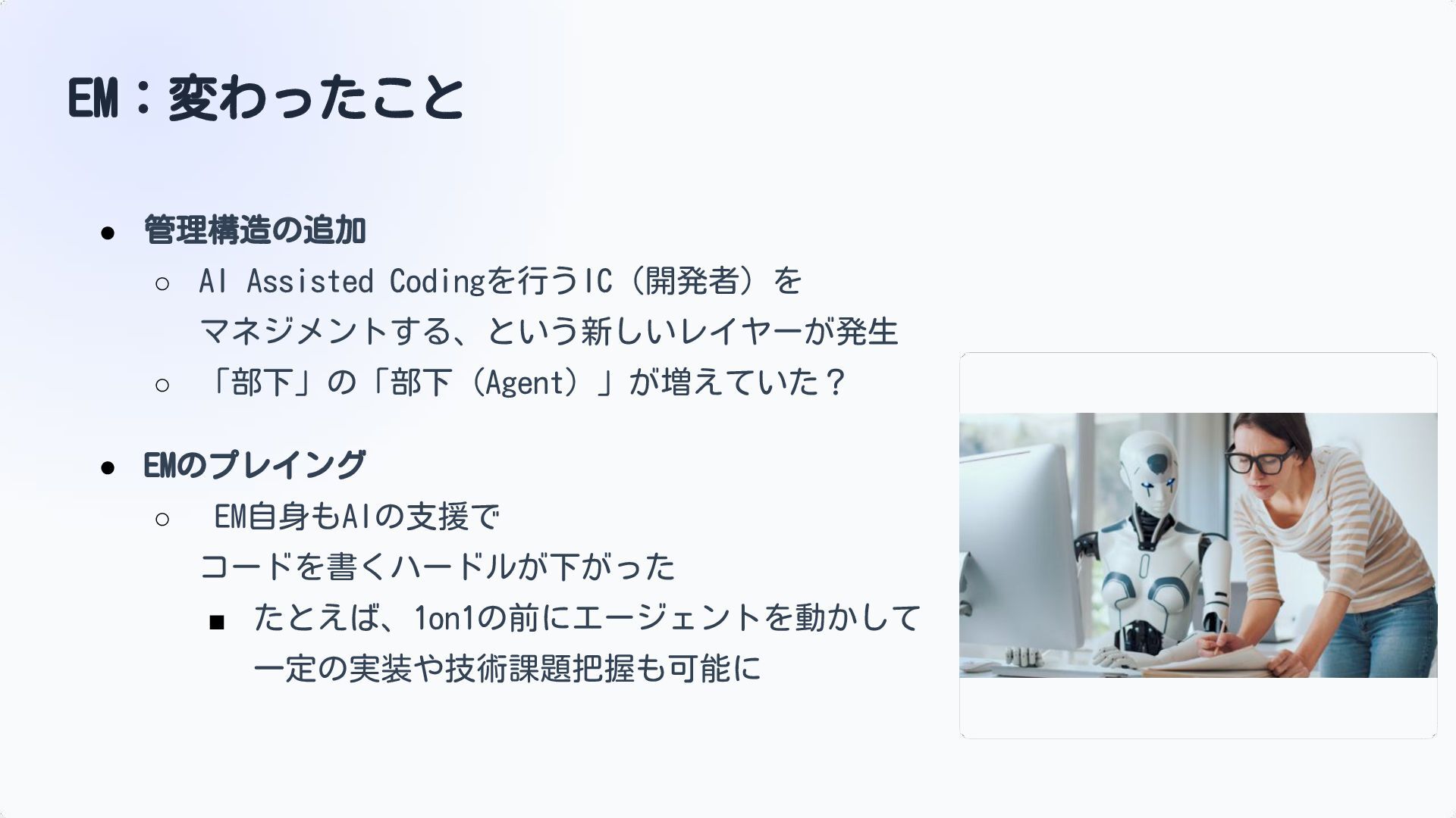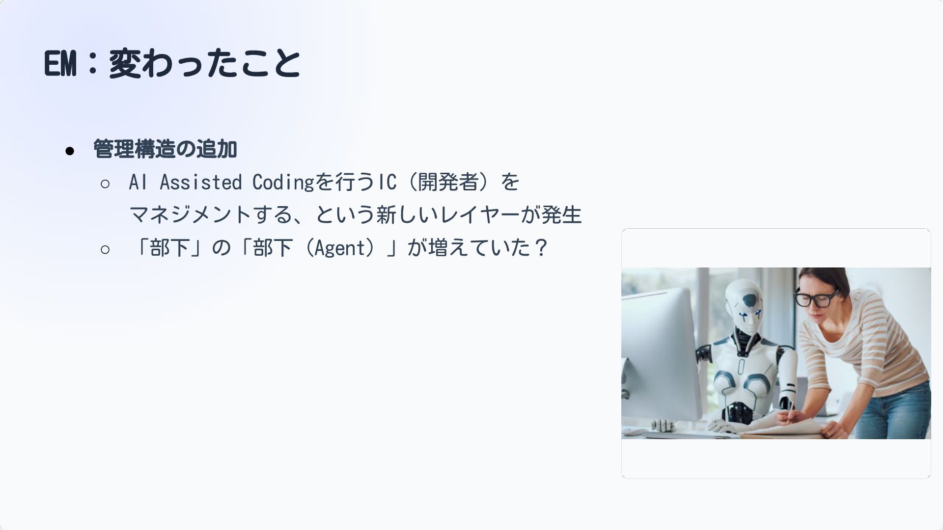 • 管理構造の追加 ◦ AI Assisted Codingを行うIC(開発者)を マネジメントする、という新しいレイヤーが発生 ◦ 「部下」の「部下(Agent)」が増えていた? EM:変わったこと
