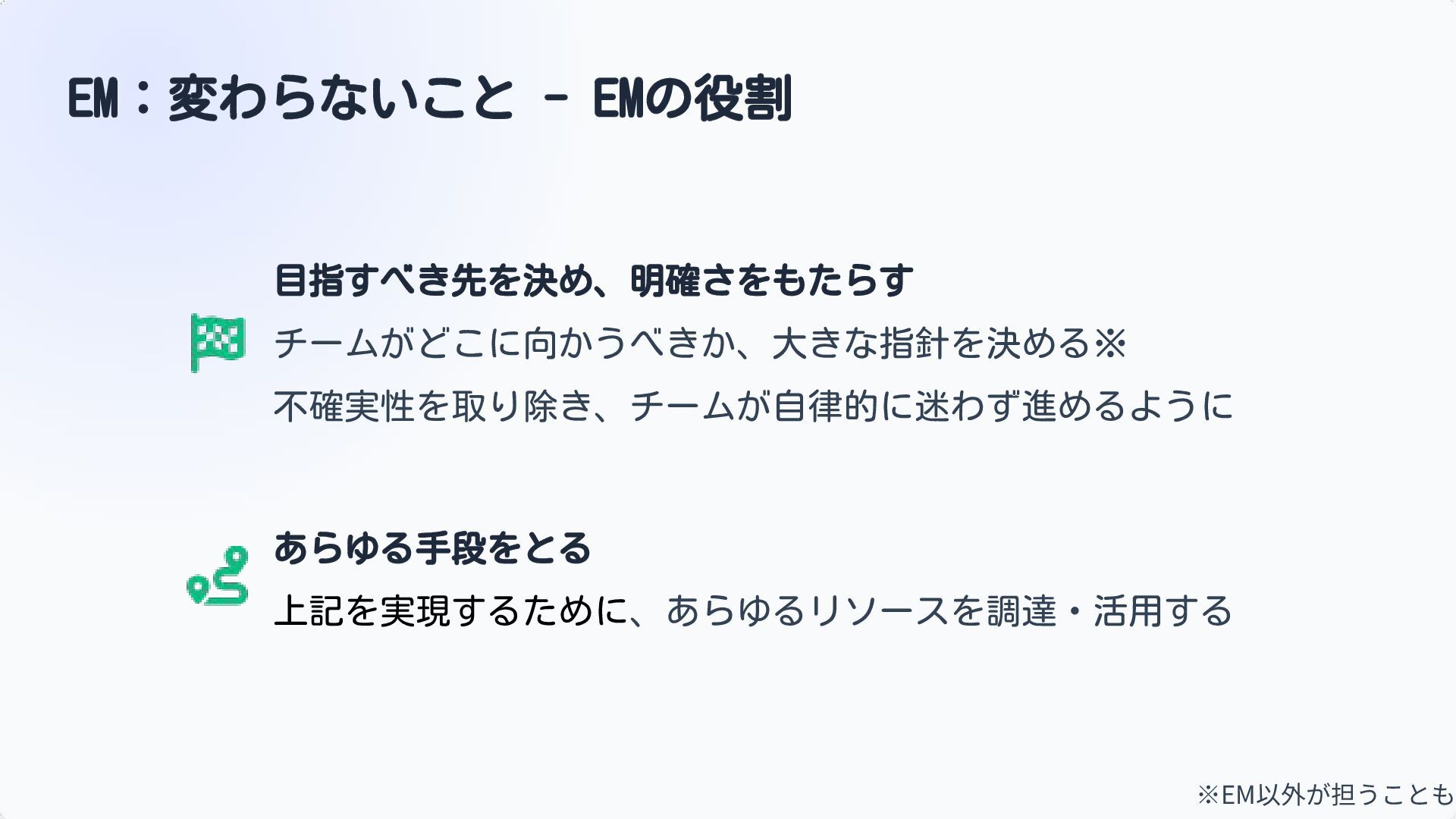 目指すべき先を決め、明確さをもたらす チームがどこに向かうべきか、大きな指針を決める※ 不確実性を取り除き、チームが自律的に迷わず進めるように あらゆる手段をとる 上記を実現するために、あらゆるリソースを調達・活用する EM:変わらないこと - EMの役割 ※EM以外が担うことも