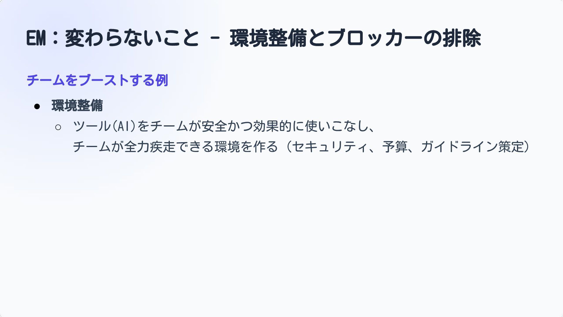 チームをブーストする例 • 環境整備 ◦ ツール(AI)をチームが安全かつ効果的に使いこなし、 チームが全力疾走できる環境を作る(セキュリティ、予算、ガイドライン策定) EM:変わらないこと - 環境整備とブロッカーの排除