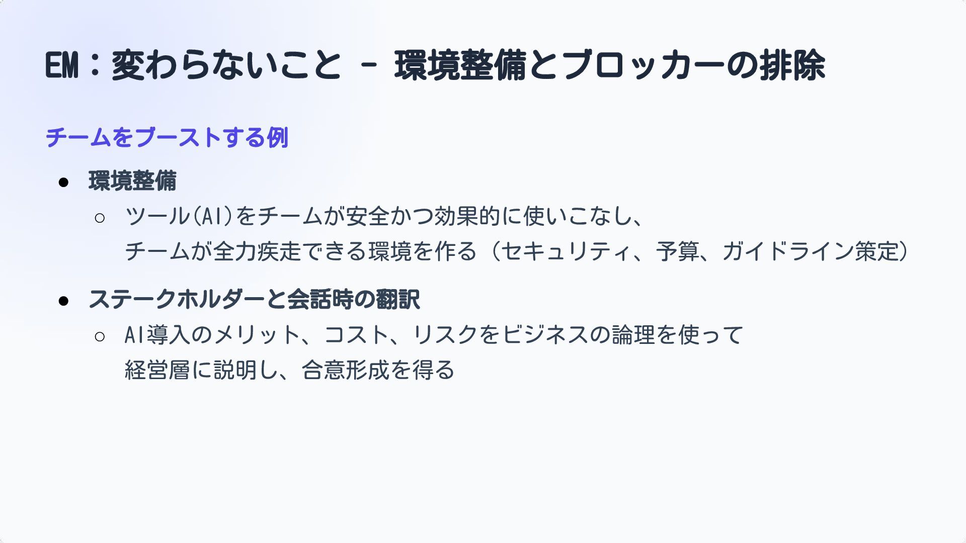 デプロイ?それ以外?)を観察し、一つずつ潰していく • 環境整備 ◦ ツール(AI)をチームが安全かつ効果的に使いこなし、 チームが全力疾走できる環境を作る(セキュリティ、予算、ガイドライン策定) EM:変わらないこと - 環境整備とブロッカーの排除