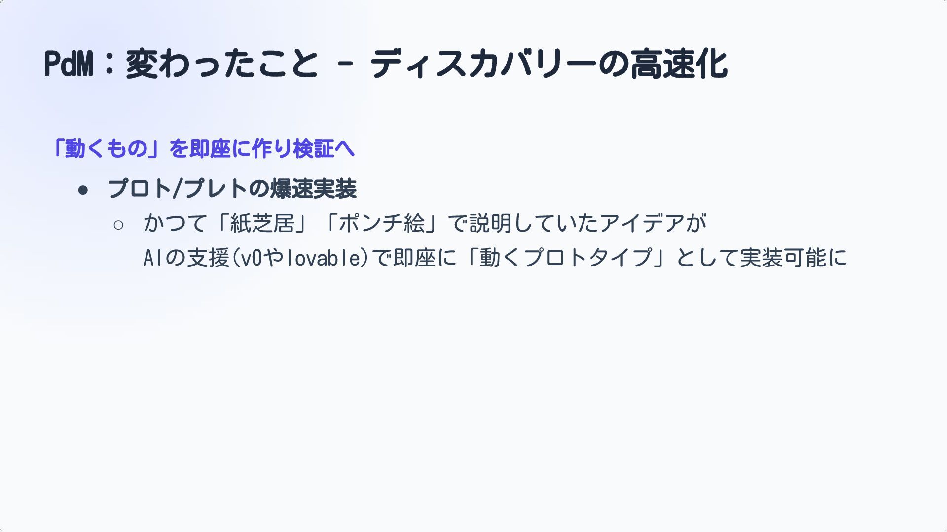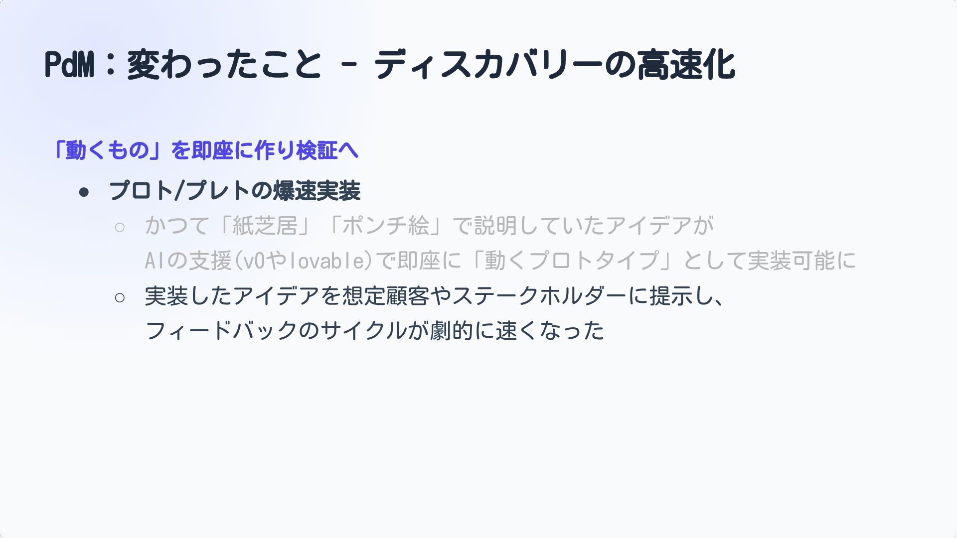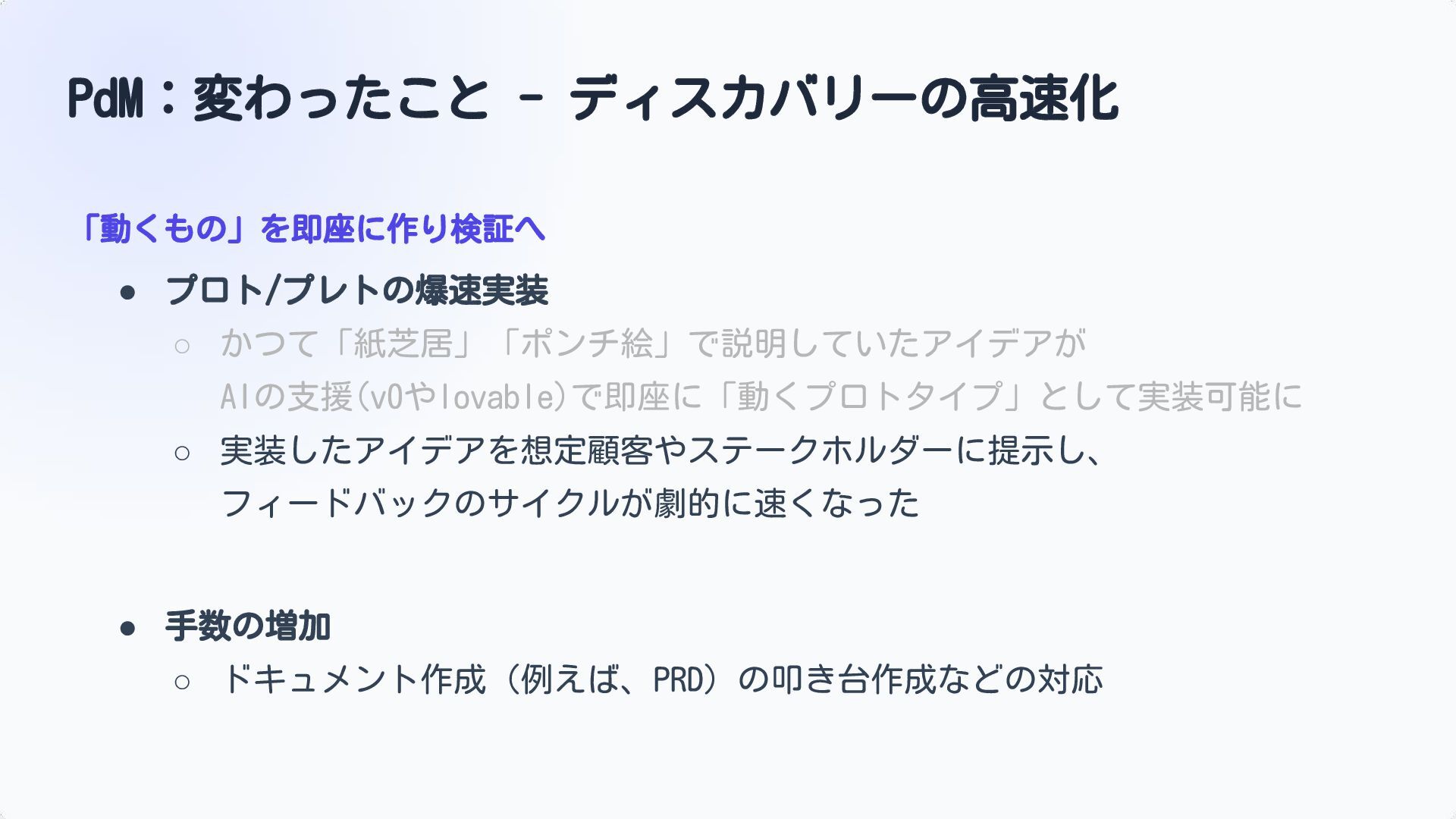「動くもの」を即座に作り検証へ • プロト/プレトの爆速実装 ◦ かつて「紙芝居」「ポンチ絵」で説明していたアイデアが AIの支援(v0やlovable)で即座に「動くプロトタイプ」として実装可能に PdM:変わったこと - ディスカバリーの高速化