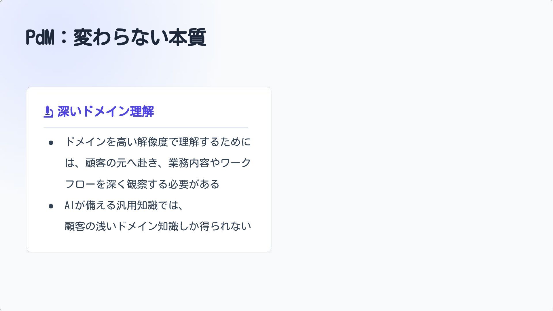深いドメイン理解 • ドメインを高い解像度で理解するために は、顧客の元へ赴き、業務内容やワーク フローを深く観察する必要がある • AIが備える汎用知識では、 顧客の浅いドメイン知識しか得られない PdM:変わらない本質