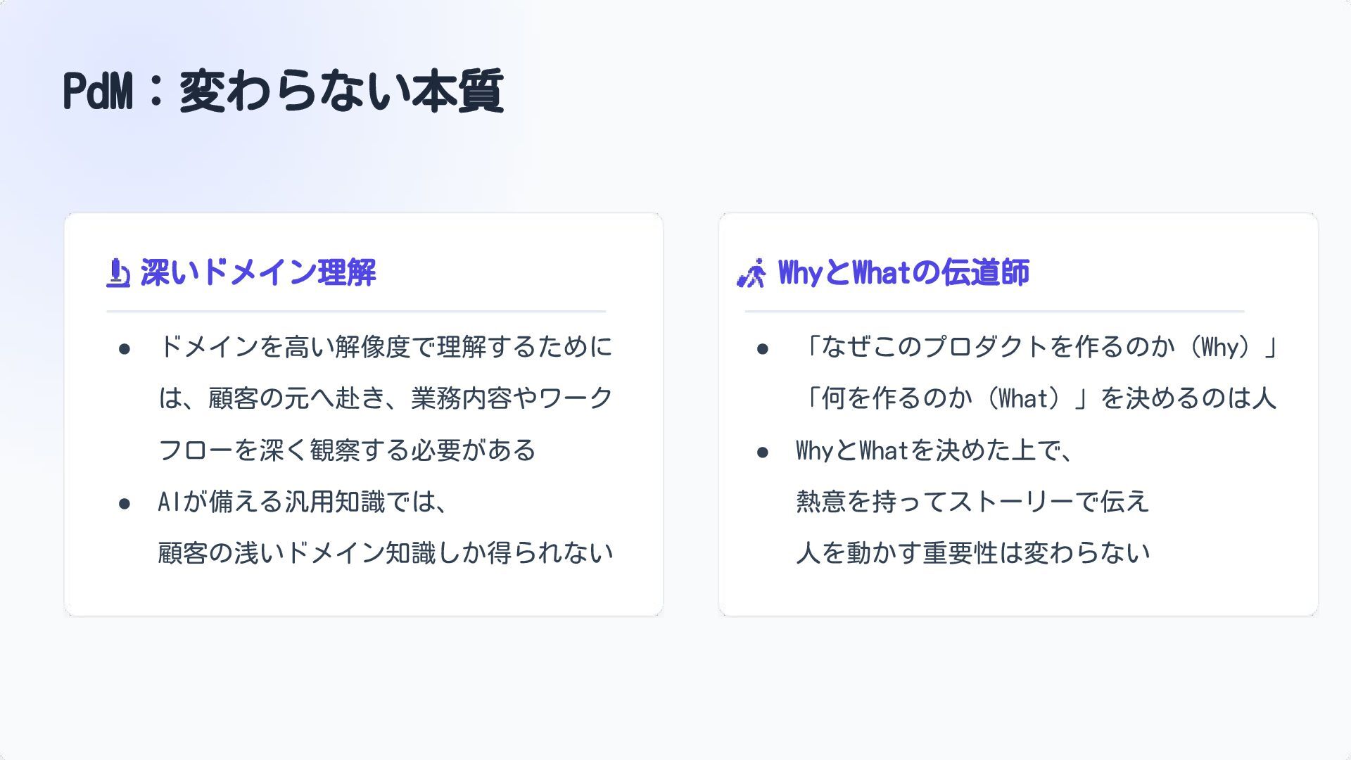 「なぜこのプロダクトを作るのか(Why)」 「何を作るのか(What)」を決めるのは人 • WhyとWhatを決めた上で、 熱意を持ってストーリーで伝え 人を動かす重要性は変わらない PdM:変わらない本質