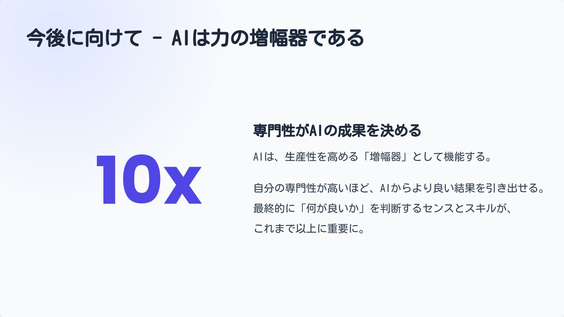 10x 専門性がAIの成果を決める AIは、生産性を高める「増幅器」として機能する。 自分の専門性が高いほど、AIからより良い結果を引き出せる。 最終的に「何が良いか」を判断するセンスとスキルが、 これまで以上に重要に。 今後に向けて - AIは力の増幅器である