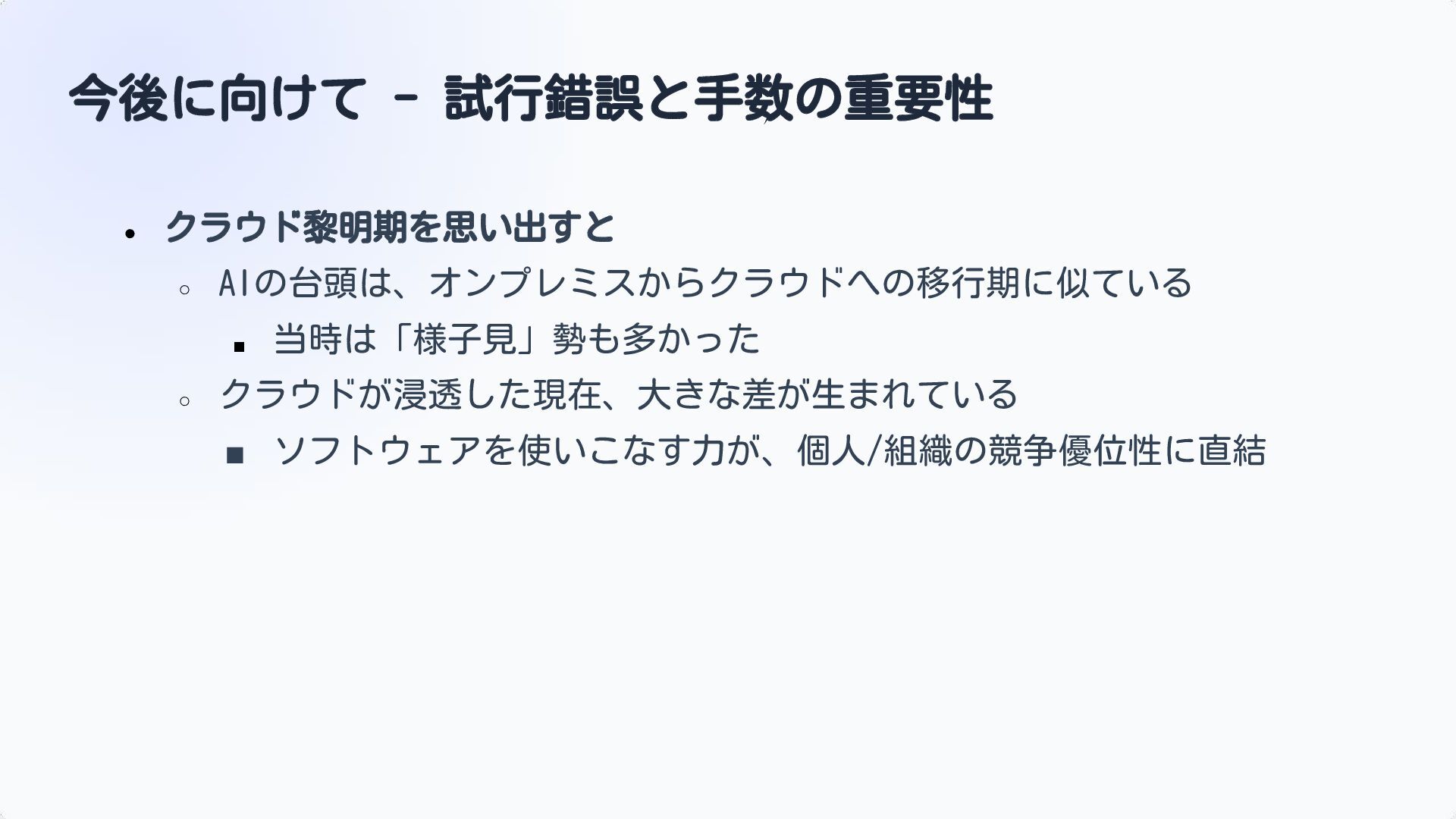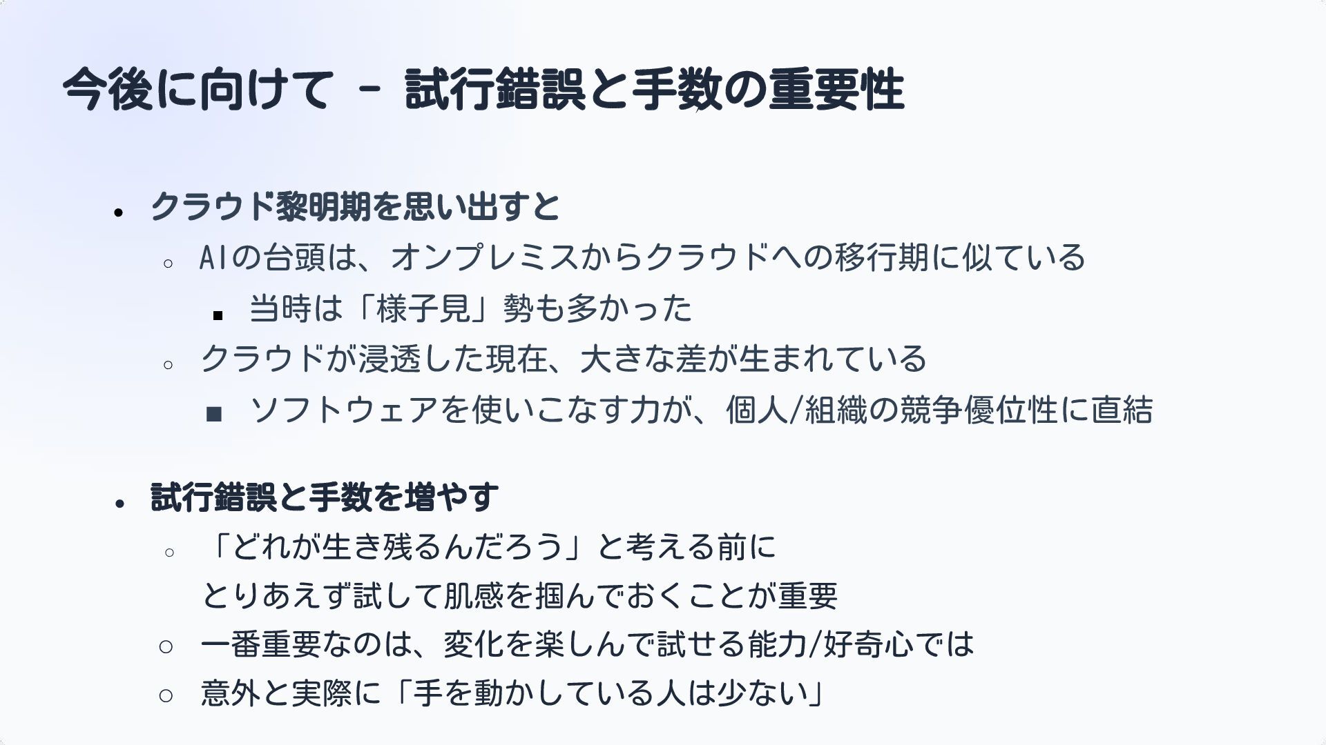 • クラウド黎明期を思い出すと ◦ AIの台頭は、オンプレミスからクラウドへの移行期に似ている ▪ 当時は「様子見」勢も多かった ◦ クラウドが浸透した現在、大きな差が生まれている ▪ ソフトウェアを使いこなす力が、個人/組織の競争優位性に直結