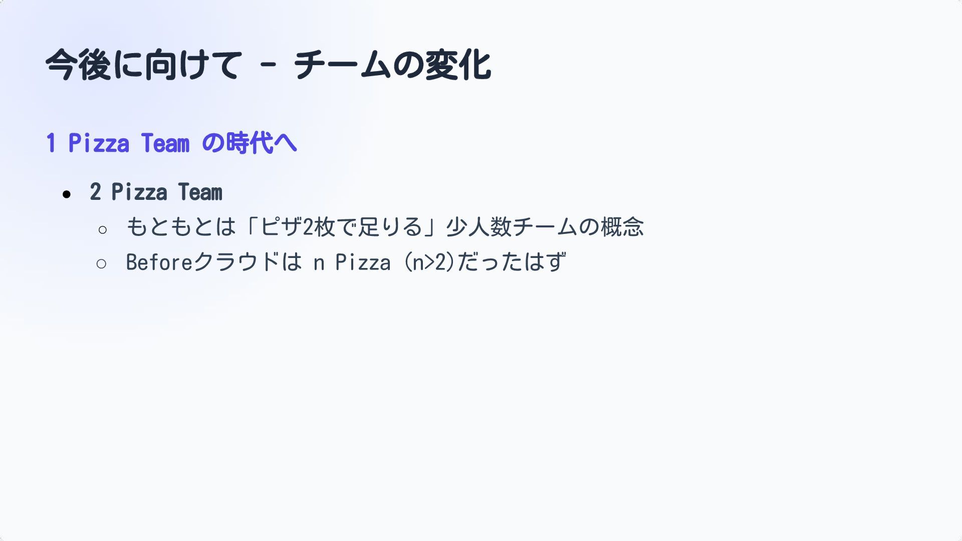 ◦ Beforeクラウドは n Pizza (n>2)だったはず 今後に向けて - チームの変化