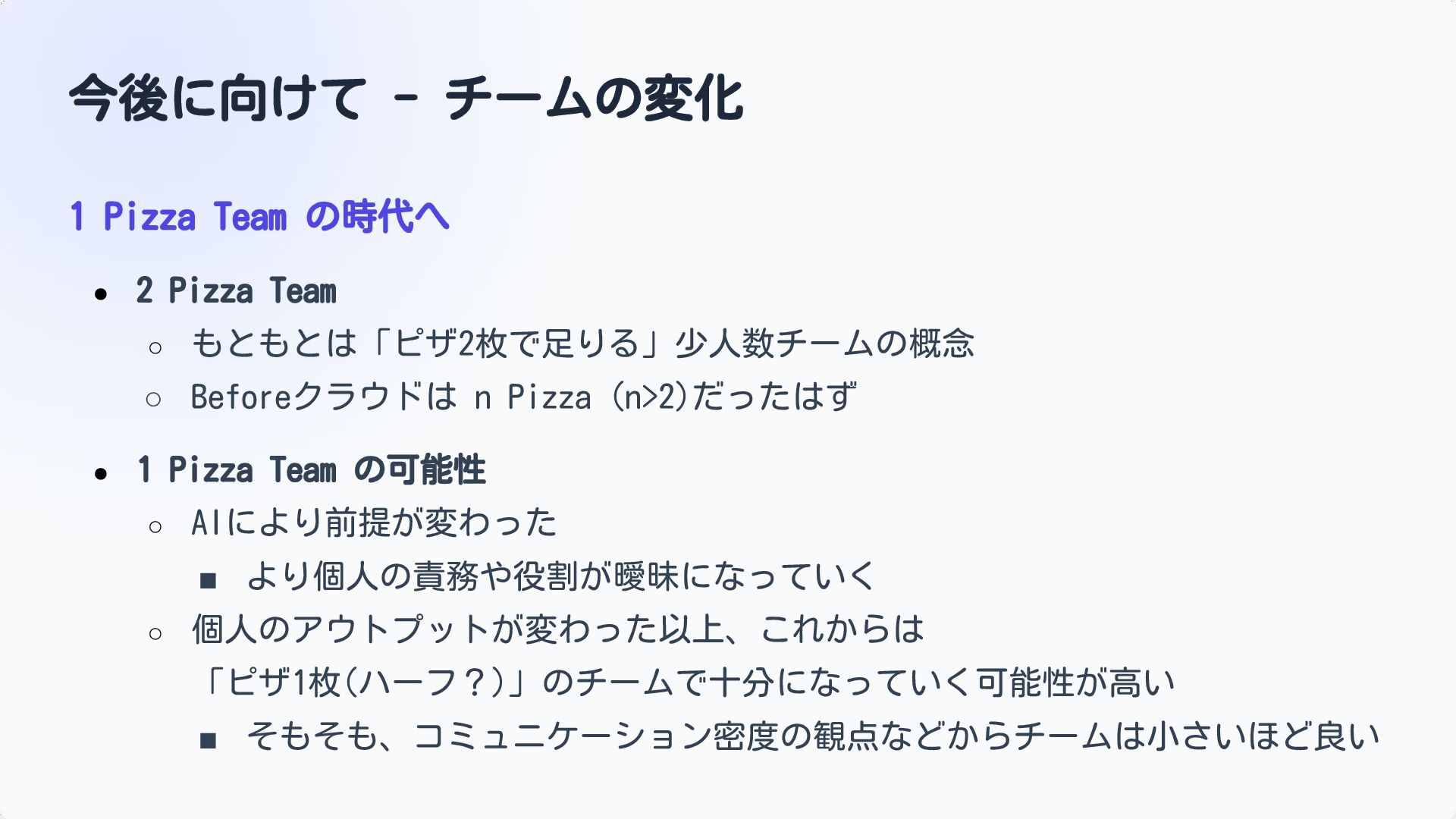 ◦ Beforeクラウドは n Pizza (n>2)だったはず • 1 Pizza Team の可能性 ◦ AIにより前提が変わった ▪ より個人の責務や役割が曖昧になっていく ◦ 個人のアウトプットが変わった以上、これからは 「ピザ1枚(ハーフ?)」のチームで十分になっていく可能性が高い ▪ そもそも、コミュニケーション密度の観点などからチームは小さいほど良い 今後に向けて - チームの変化