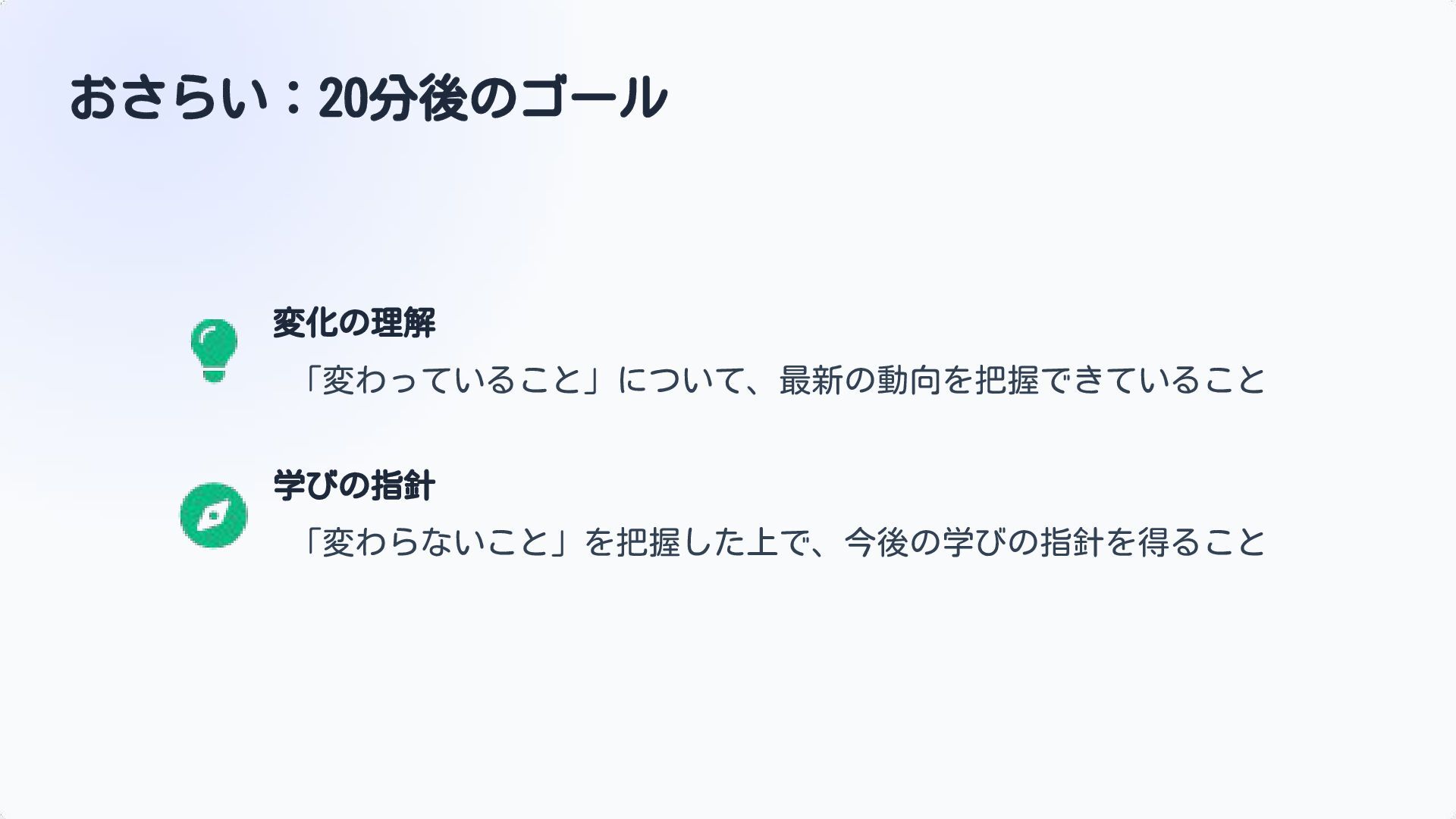 変化の理解 「変わっていること」について、最新の動向を把握できていること 学びの指針 「変わらないこと」を把握した上で、今後の学びの指針を得ること おさらい:20分後のゴール