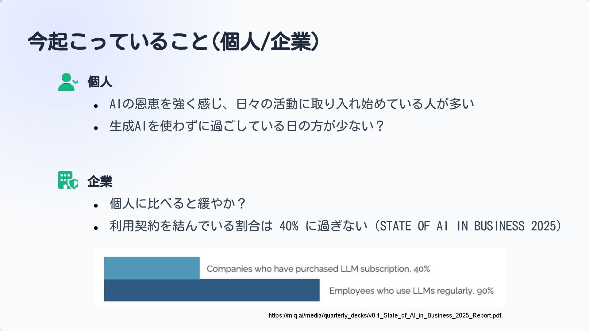 40% に過ぎない (STATE OF AI IN BUSINESS 2025) 今起こっていること(個人/企業) https://mlq.ai/media/quarterly_decks/v0.1_State_of_AI_in_Business_2025_Report.pdf