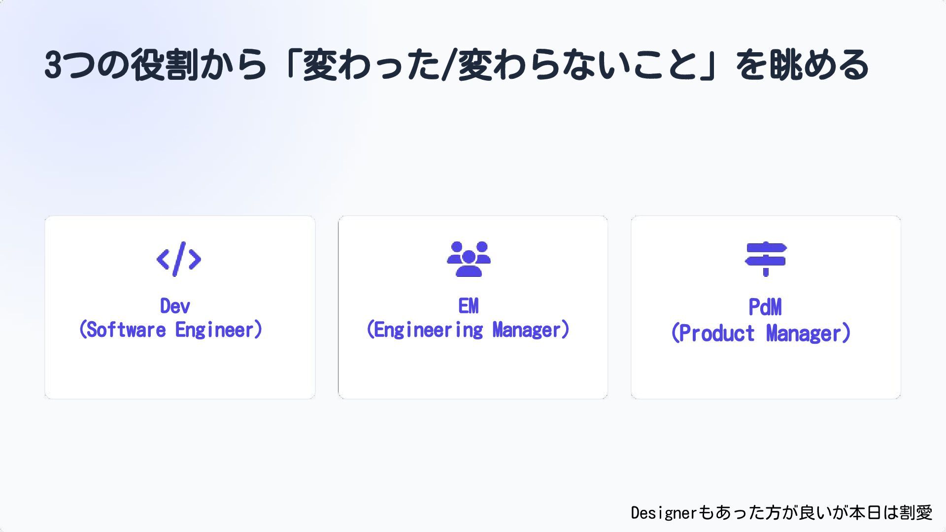 Dev (Software Engineer) EM (Engineering Manager) PdM (Product Manager) 3つの役割から「変わった/変わらないこと」を眺める