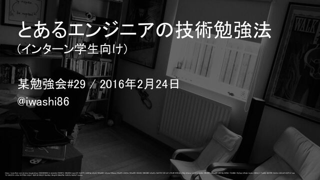 とあるエンジニアの技術勉強法 (インターン学生向け) 某勉強会#29 / 2016年2月24日 @iwashi86 https://www.flickr.com/photos/dougbelshaw/5563803628/in/photolist-9tDWYL-58Q5BA-nqwnZE-HmEPC-bhNFAg-dZjJL2-9HpKB1-dZjJax-6Wqocy-NhaPh-nGHSrx-8KxsW3-3iHnSU-58KUMH-dZqrEu-4bATE4-3iD1aV-cY8JW-9E5hAj-oVibj-dZqtcw-spC37x-Qe8oL-6fLhWT-oRmwRR-5Kf18p-6XRdr-75vNMn-2tdZgq-yRndjo-iexdcx-8AHoL1-7np8Ai-9jDF2B-HmGtu-btKJe9-bG2YvZ-qax 7U-5ACEPk-oVibe-8HTRQn-bXjtn7-9jDFcB-6KhjVf-6jwWqL-9hngV4-8MmPNn-9z6L3b-6q5fyP-tzpQw